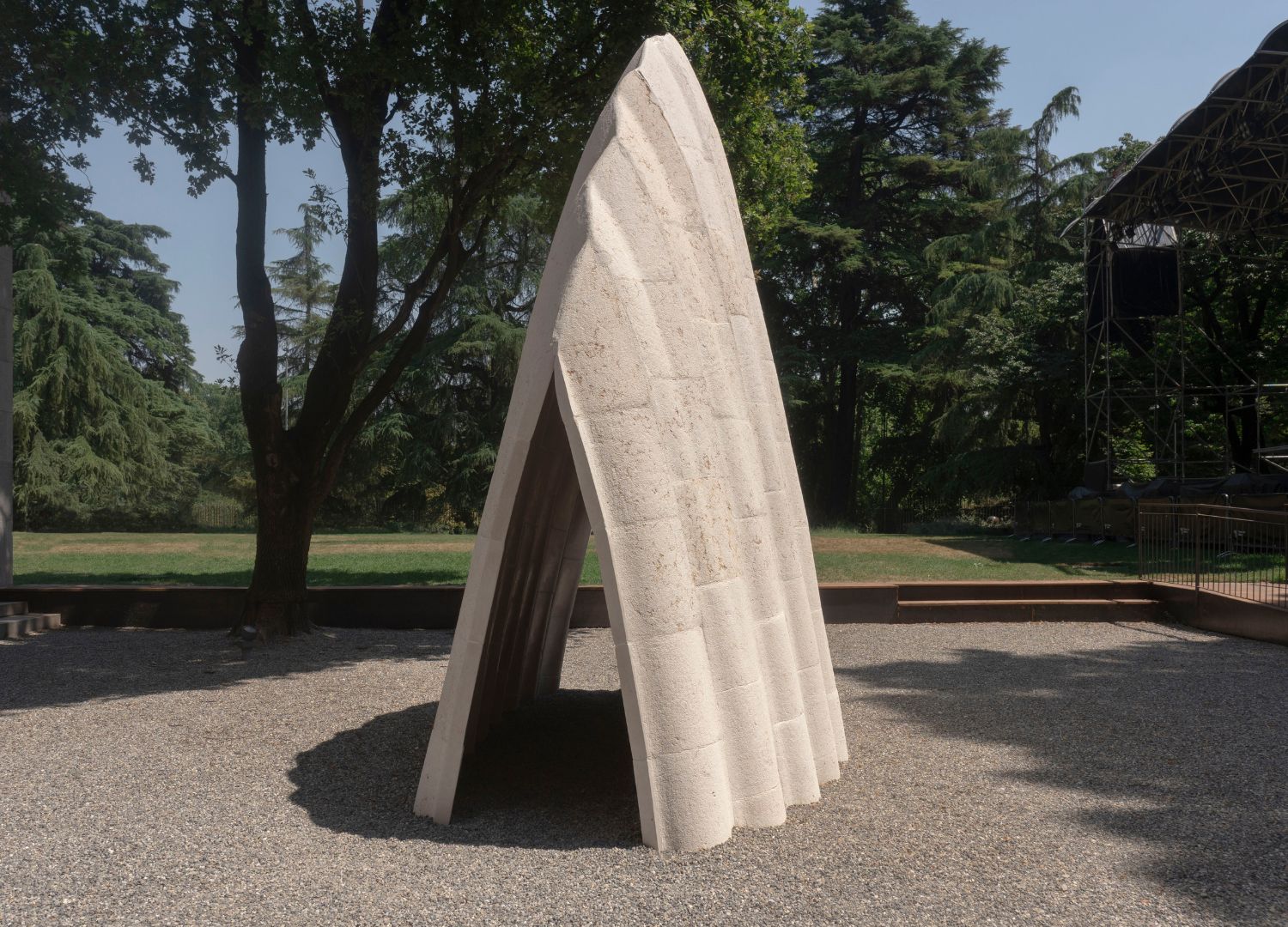 At the 24th International Exhibition of Triennale di Milano, a powerful stone structure rises in the garden like a creature unearthed from the desert. Named Tiamat, it is the latest evolution of Stone Matters, a long-term research project by the architectural studio AAU Anastas. Founded by brothers Elias and Yousef Anastas between Paris and Bethlehem, in Palestine, the studio’s work operates at the intersection of experimental form, material intelligence, and political awareness. With Tiamat, they push the limits of stone’s expressive and structural possibilities, drawing inspiration from Gothic ribbed vaults, the shifting topographies of sand dunes, and ancestral techniques of stereotomy.