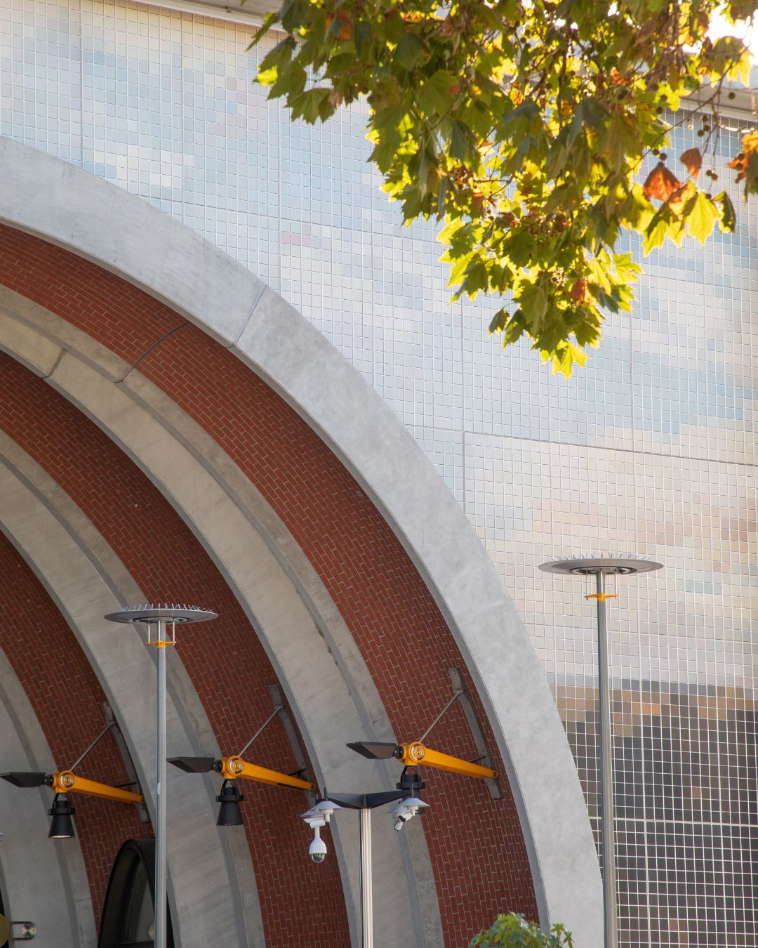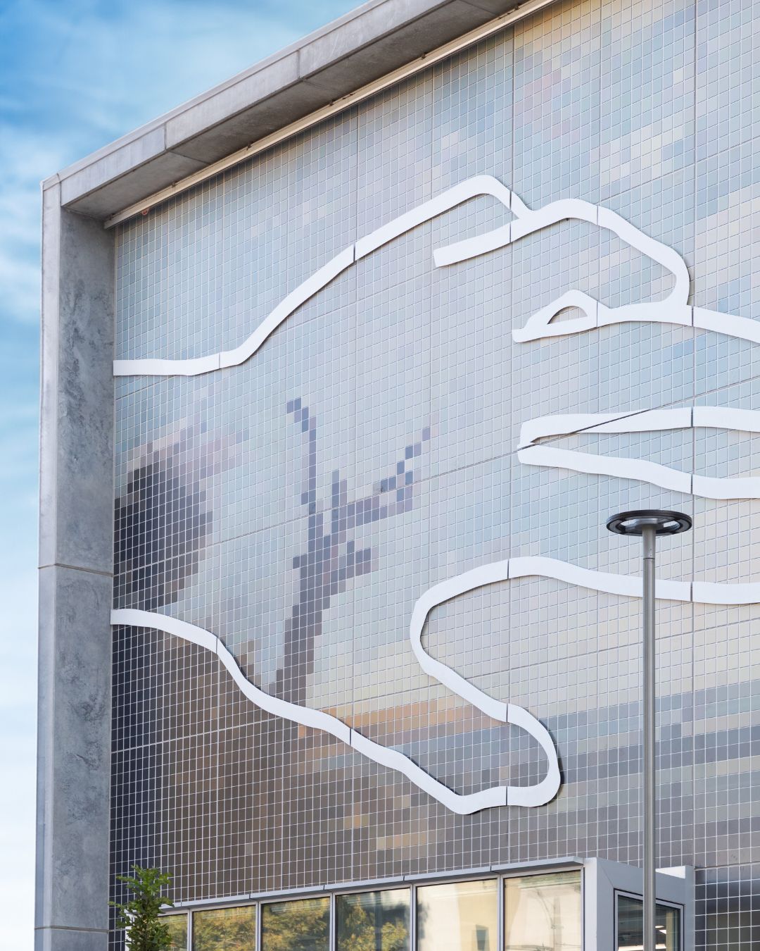 One of the main difficulties in the construction of the Arden Station was also to be able to replicate Abdul Abdallah’s artwork on the façade through manufacturing. This was done through Iris Ceramica Group’s Design Your Slabs (DYS) technology, which offers the possibility to customise ceramic surfaces with any image or illustration. The result is a skin that serves as public art that is inherent in the architecture, instead of being applied as an afterthought.