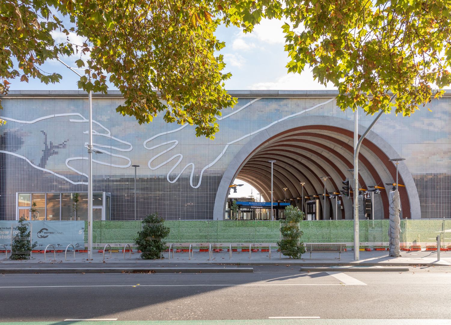 The story of the station’s architecture begins with artist Abdul Abdullah’s vision to transform J.S. Calder’s painting “View from Royal Park across West Melbourne Swamp” from 1860 into something entirely contemporary. With the theme of convergence, the artwork shows two massive aluminum hands reaching towards each other, representing the station as the meeting point between different cultures and between older and future generations. It is not only a nod to Melbourne’s multicultural character, but also a metaphor for public infrastructure as a mediator of collective identity.