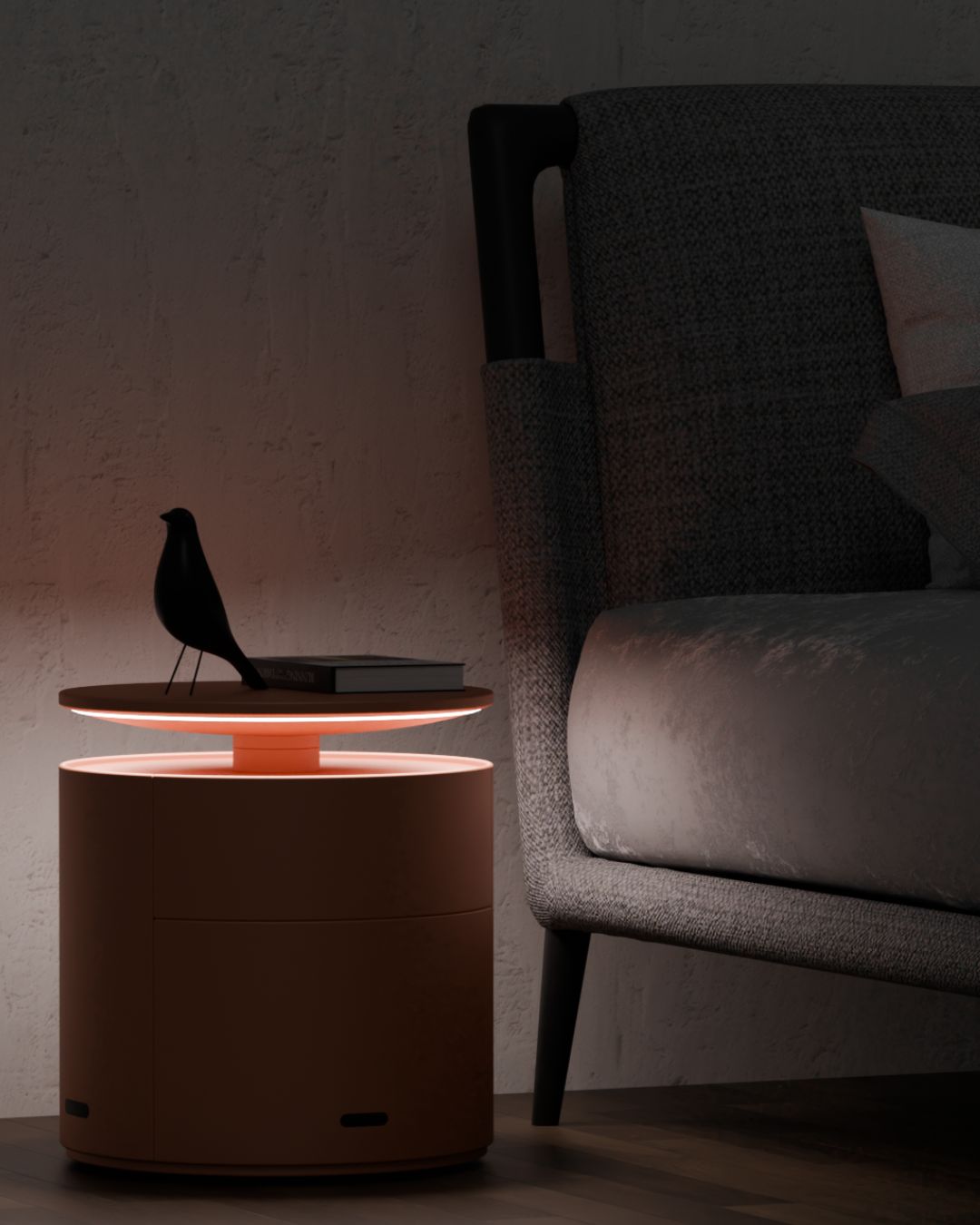 At first glance, Bable appears to be a simple, well-crafted side table. But beneath its quiet exterior lies thoughtful technology designed to move in harmony with you. At night, Bable powers down and recharges—no visible cables or docking stations. Charging is seamlessly integrated into its base, maintaining the clean, furniture-like aesthetic. This shared rest cycle reinforces Bable’s role not as a device, but as a friend that mirrors your natural rhythm.