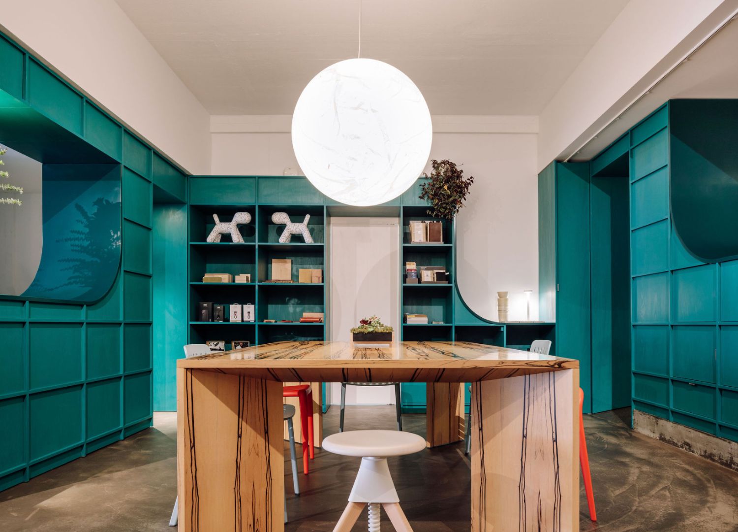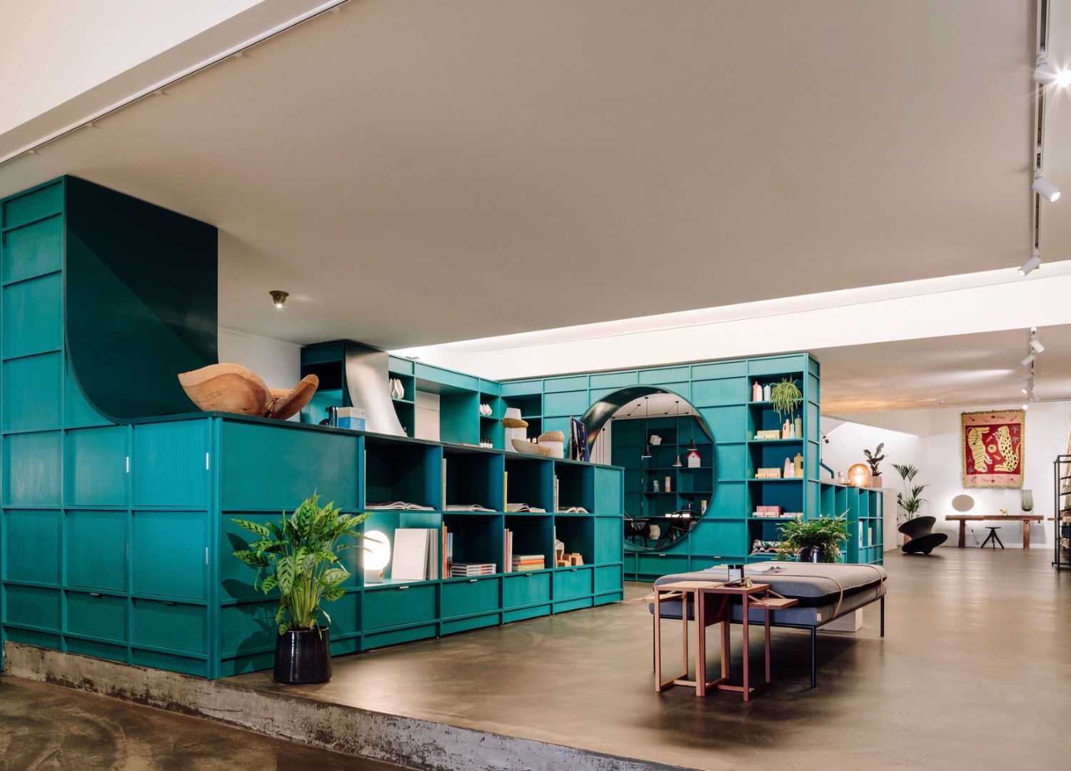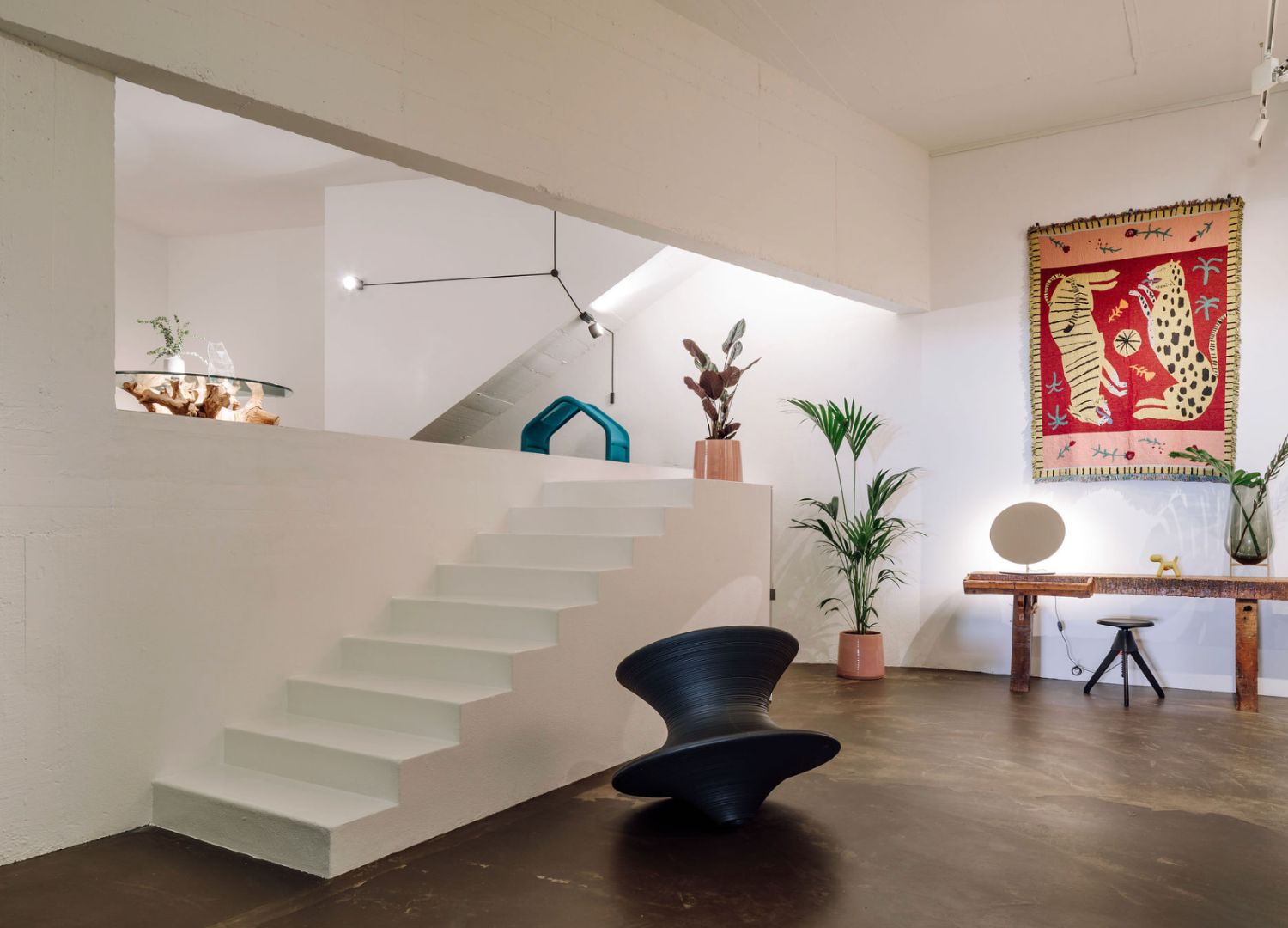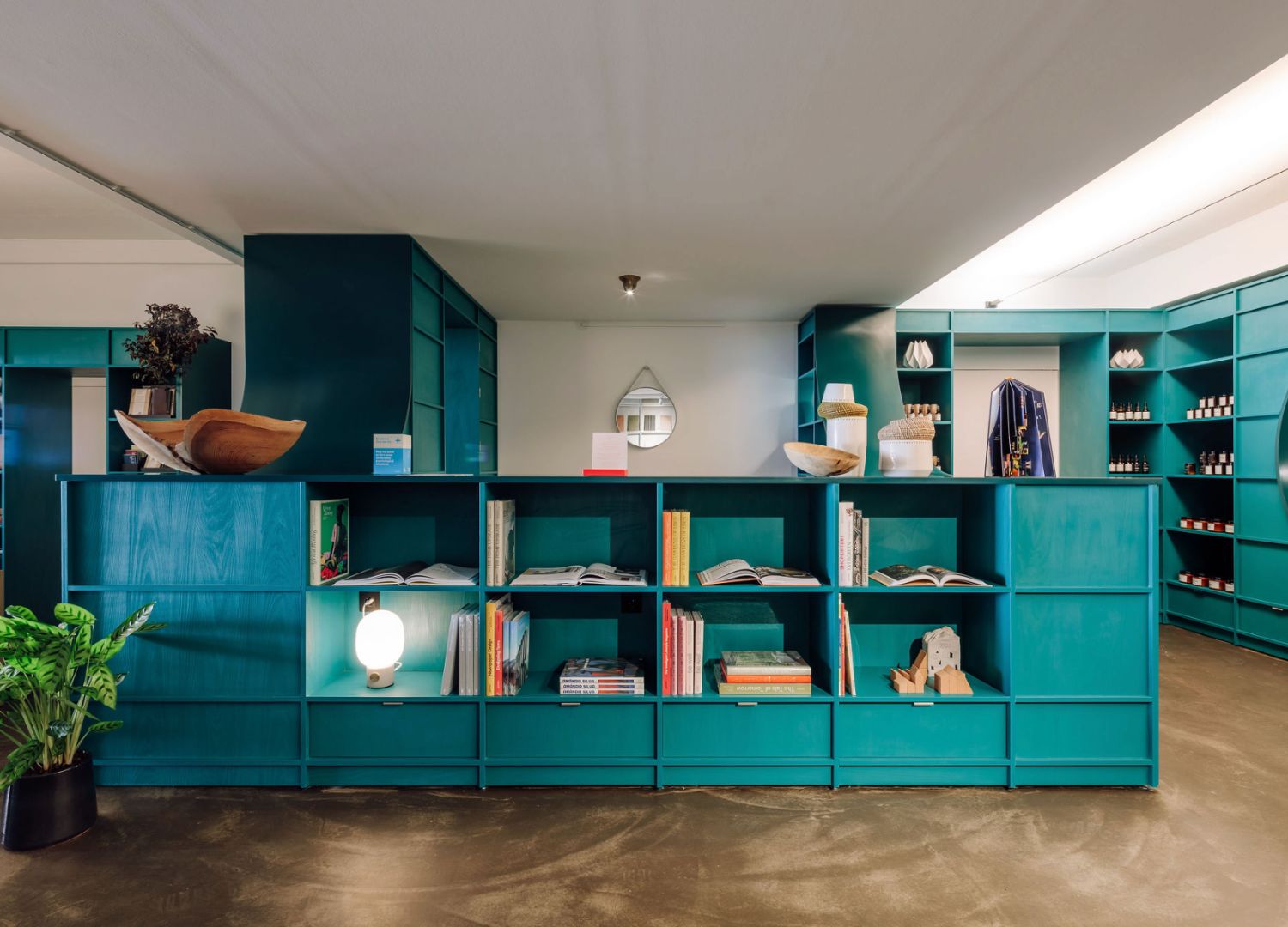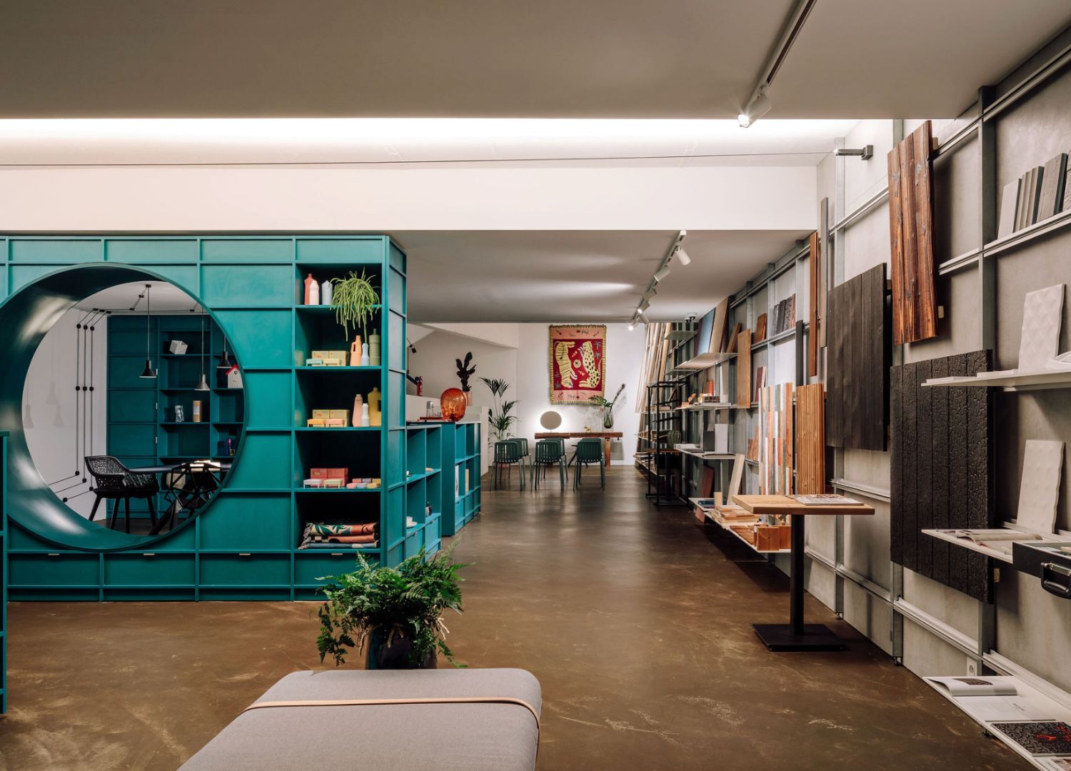 An open-plan layout helps to blur the distinction between the creative lab, the gallery and concept store, resulting in a vibrant interior that is part showroom and part lounge. “The Banema Concept Store space is organized along a piece of wooden furniture that meanders through the space,” the architects explain. “[This is] designed from a module that is repeated, creating areas for sharing both activities, meeting spaces and exhibition niches.”