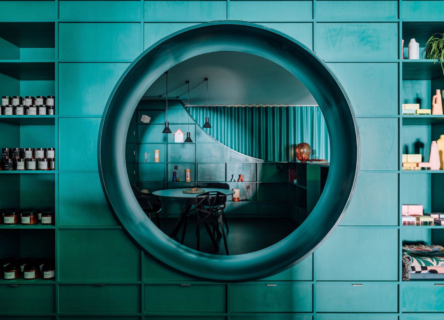 Banema is one of Portugal‘s leading manufacturers of wood products and derivatives. As such, the Banema Concept Store focuses on the alluring diversity of timber. From the street, two large windows serve as miniature gallery-like spaces for highlighting products, either with or without curtain backdrops. Either way, the eye-catching turquoise shades work to pull people in from off the street.