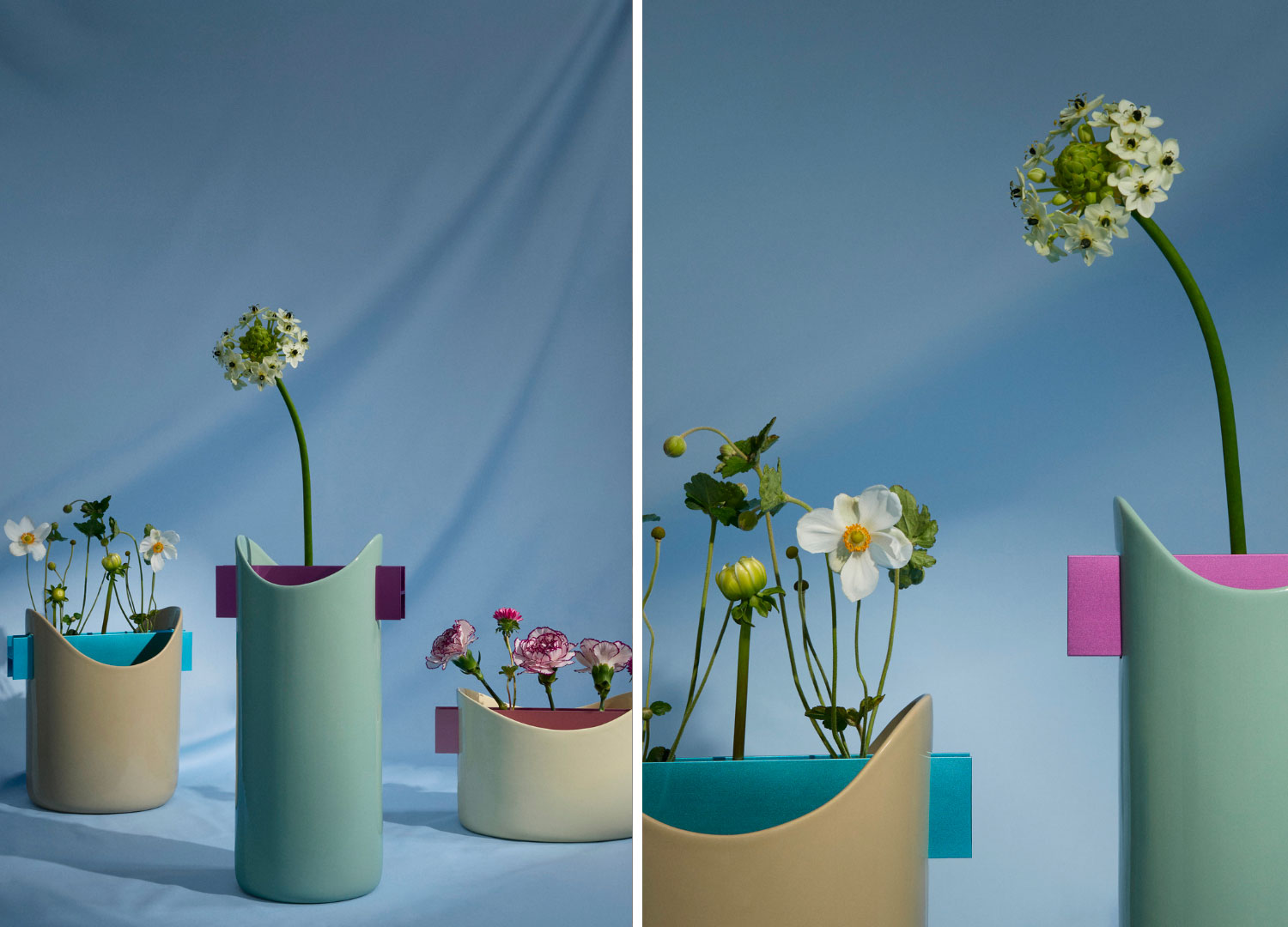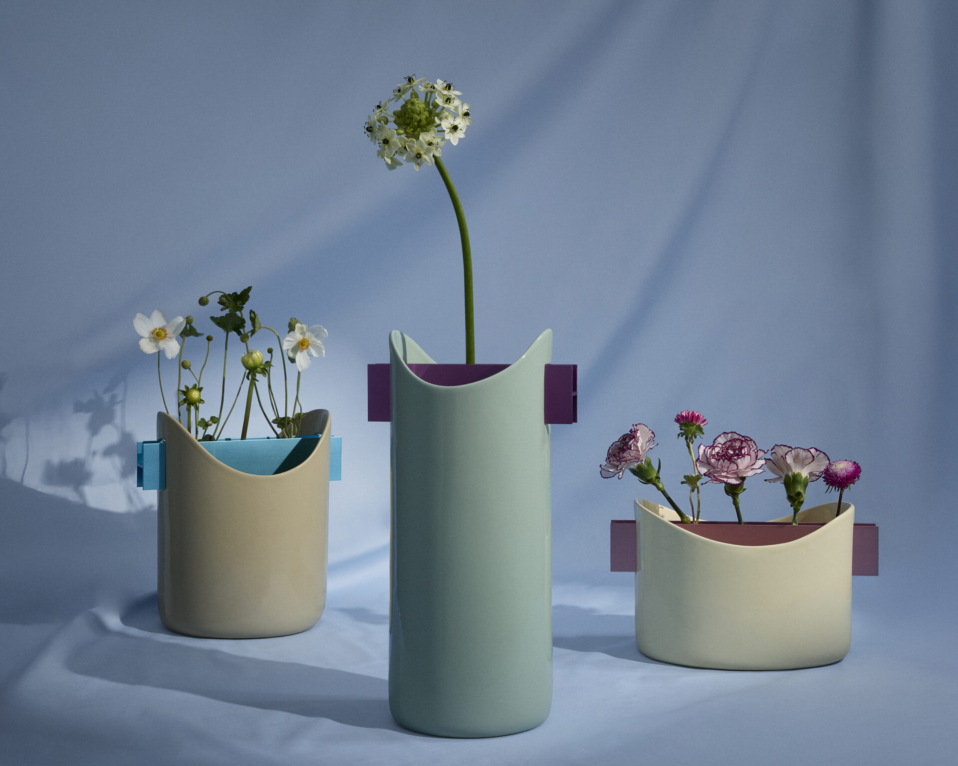 What makes possible what Chiara calls “everyday practices of beauty” is the very structure of the vases: the encounter between two elements, ceramic and anodized aluminum, drawn respectively from the worlds of craftsmanship and construction. The container structure is handcrafted by a family of Milanese ceramists and glazed in delicate pastel tones. Its surface reveals small imperfections that not only make each piece inevitably unique but also celebrate, through those irregularities, the artisanal process from which the work originates.