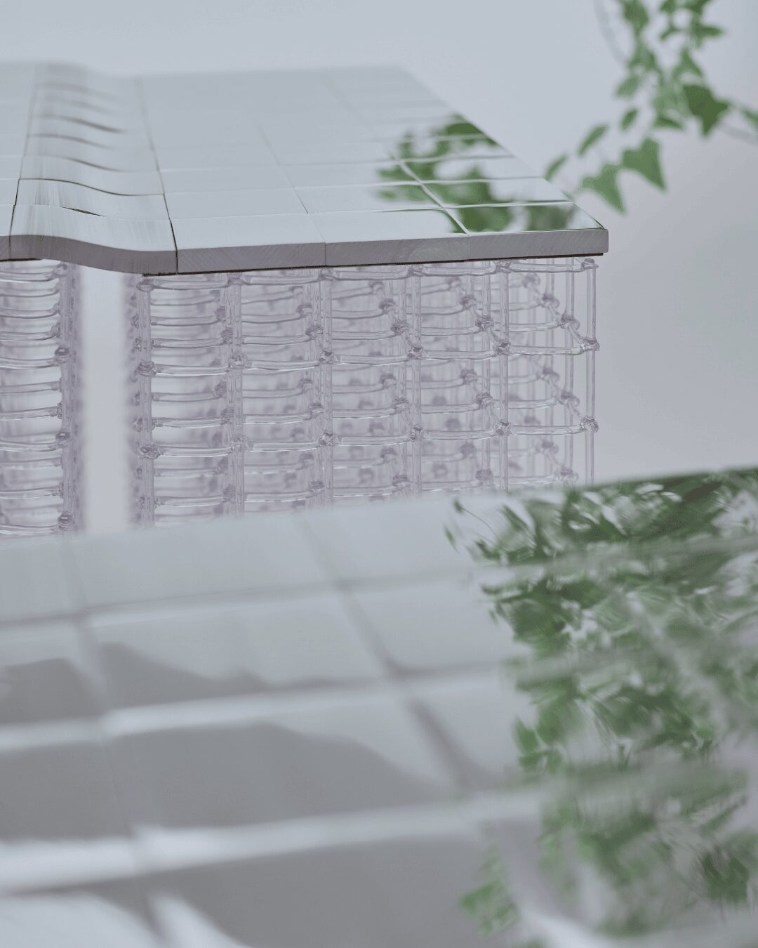 The material is applied as the top of the Flux Table, serving as a tangible proof of the union between digital and analog, technological control and human sensitivity. The white base of the piece is designed to highlight the tabletop and is made in collaboration with 130 (ONE THIRTY), a design brand that shapes materials in three dimensions with an innovative technique to generate spatial structures from a single continuous frame. 130 also oversaw the production of the entire installation.
