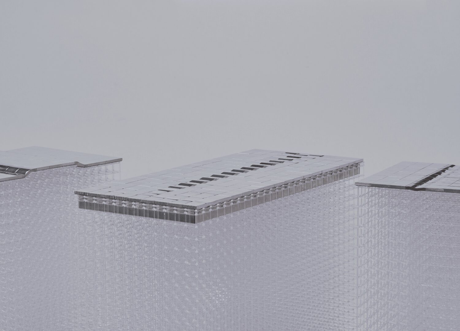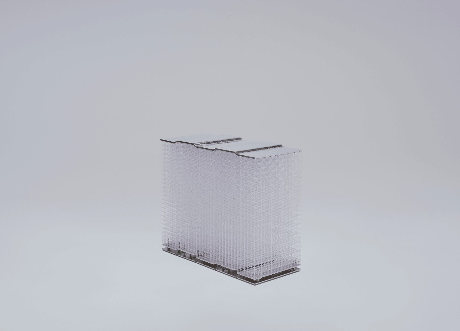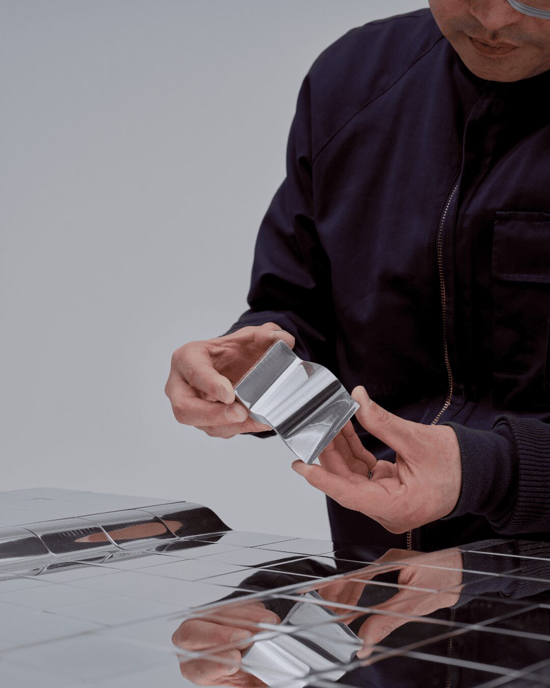 Structurally engineered metal is obtained by joining multiple panels, appearing compact yet irregular, while maintaining notable flexibility. When polished, the ultra-thin aluminum layers reveal a unique aesthetic: a viscous, fluid surface reminiscent of a mirror of water, thanks to the sheet’s light-reflecting qualities.