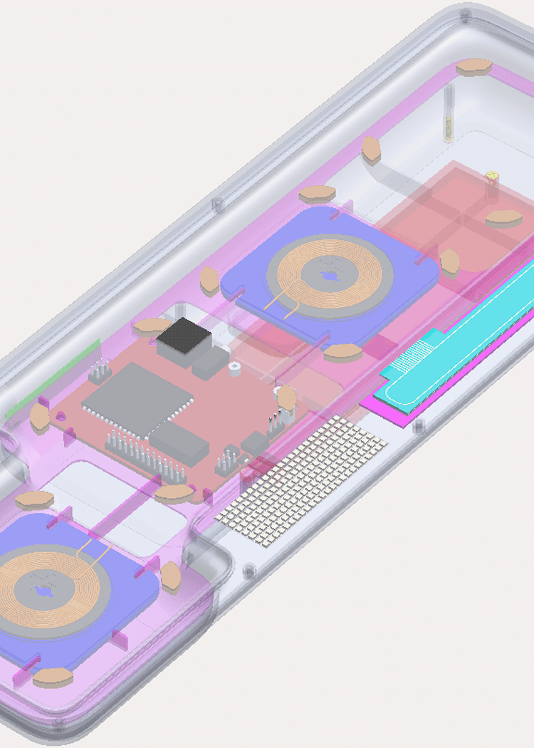 A priority for Barnes when designing the concept product was to build trust between the device and the user. As a result, he carefully considered the look, feel and wider touch-points of the product. Underneath the tray, a series of cards explain the positive impact or properties of each element. There’s also an LCD clock display to assist users in tracking the time when accessing pain relief.