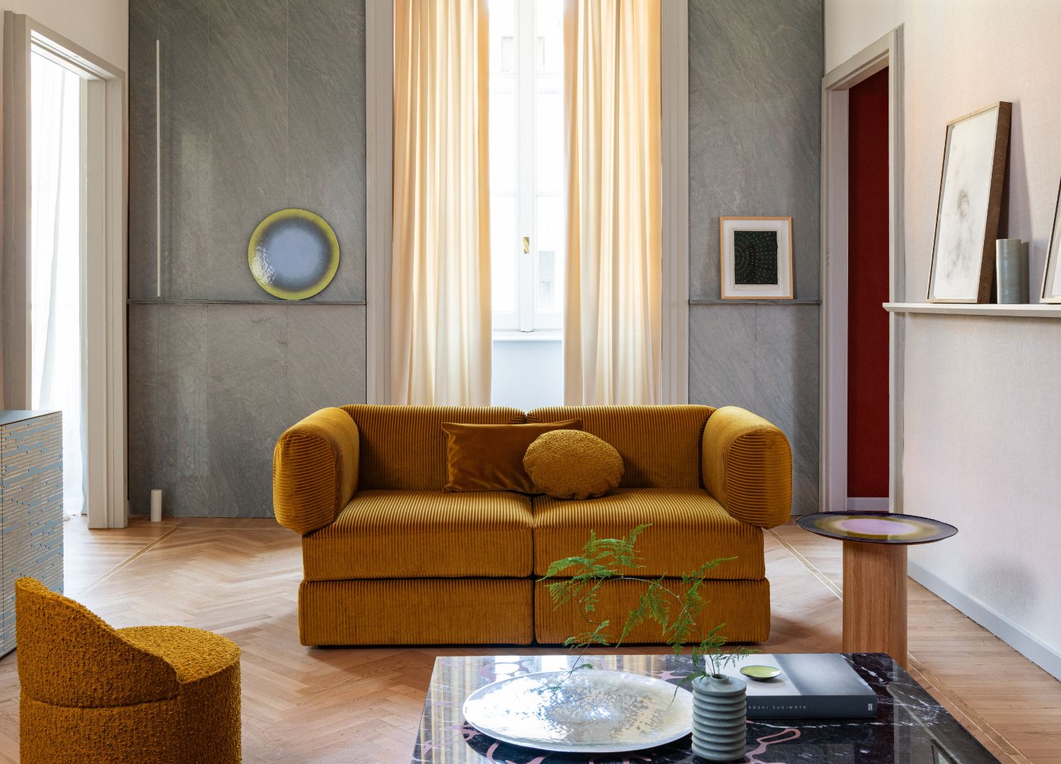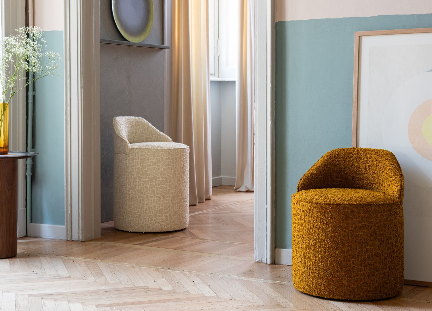 The BENU Recycled Upholstery line expands the company’s long-term commitment to responsible production, as each fabric in the collection is made from recycled fibres sourced from post-consumer PET bottles and fashion industry waste. The collection’s range merges performance and aesthetics in its various declinations, from the tactile richness of BENU Bouclé, to the softness of BENU Velvet, to the rhythmic graphics of BENU Globe and BENU Bricks.