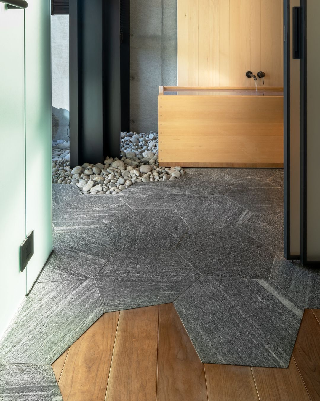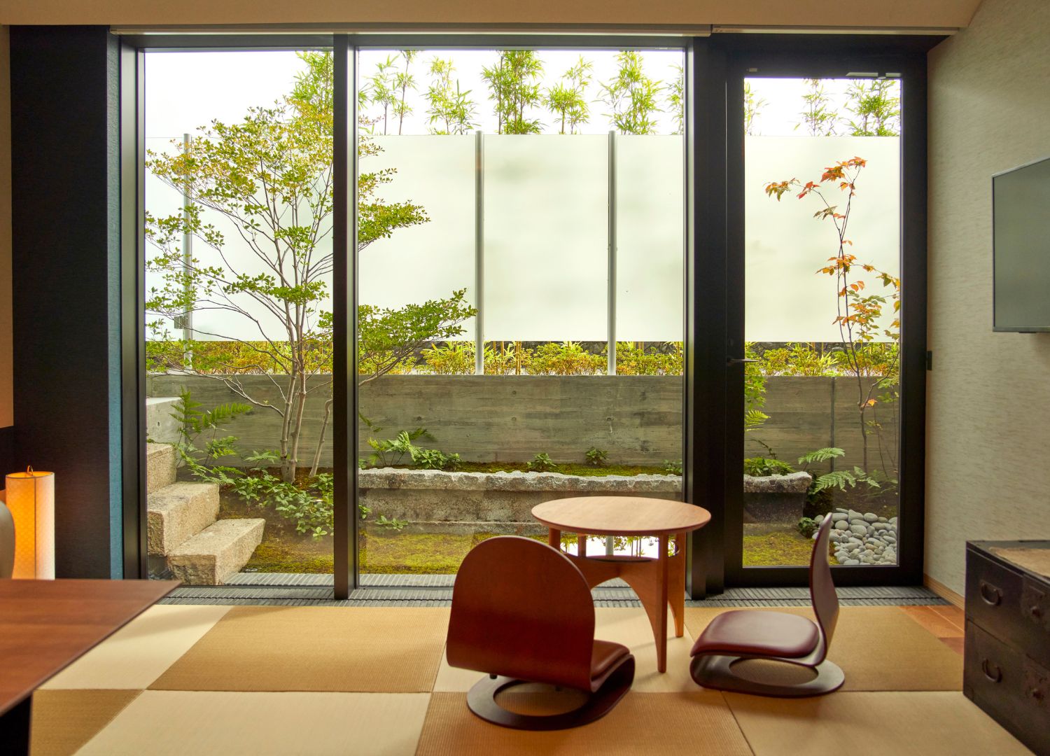 That tension — between the visual register of traditional Japanese aesthetics and the haptic register of contemporary ergonomics — runs through every room. All 19 rooms and suites include tatami areas alongside sofas, floor heating alongside radiant air cooling, and baths that reference Japanese bathing culture while delivering entirely contemporary performance. Nine riverside rooms have balconies. Every room has a view — either the river, the city skyline, or an enclosed tsubo garden that brings the outside in with the controlled intimacy of a still life.