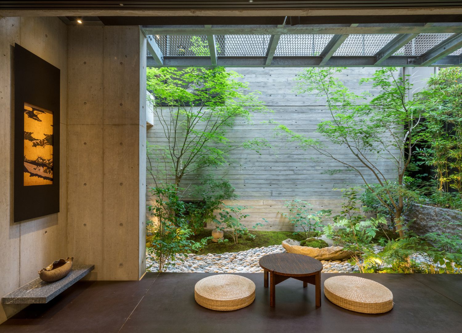 On the roof, the Sky Forest Garden plants species mentioned in the Tale of Genji — not as a replica of any specific Heian garden, but as an embodiment of the novel’s sensibility toward nature: attentive, reverential, aware of subtlety and complexity. In Japanese urban tradition this kind of retreat — a sanctuary within the city — is called shichū-in (市中隠), a hermitage within the city, or shichū no sankyo (市中の山居), a mountain hut within the city. The rooftop at Genji Kyoto earns both descriptions.