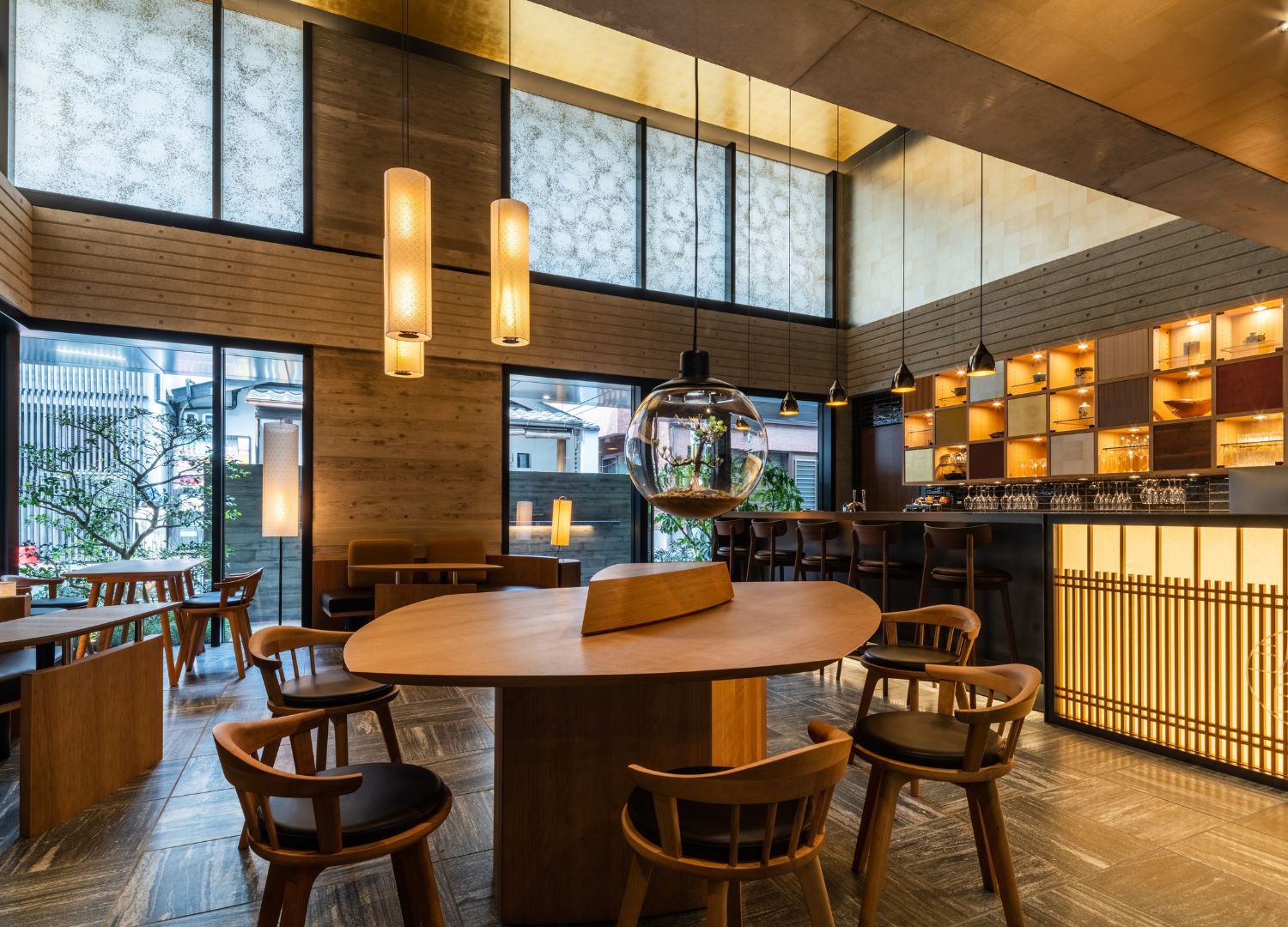 The custom furniture throughout the hotel was designed by Tomita and made by hand by craftsmen from Kyoto’s Futaba Furniture and +veve, the design duo of Yoshito Dodo and Kotaro Kawanabe, who have been at the forefront of Japan’s new wave artisanal movement since 2012. Every piece — entrance stools, lobby tables, bar chairs, tatami furniture — was conceived for the specific spatial and ceremonial logic of the hotel. The lobby’s sculptural centrepiece table and sofa-table sets, in particular, hold their ground against the architectural weight of the space around them.