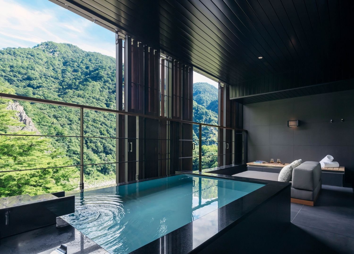 All guest rooms include semi-open-air hot spring baths, and most are designed as maisonettes. The split-level arrangement creates two complementary conditions: a bathing zone oriented to breeze and humidity, and an indoor living/sleeping zone designed for quiet restoration. Non-circulating natural spring water and in-room bathing are positioned as central to the experience, allowing guests to set their own pace rather than follow fixed schedules. Large windows turn the valley into a shifting backdrop; the landscape reads almost like a moving screen, changing with light and weather.