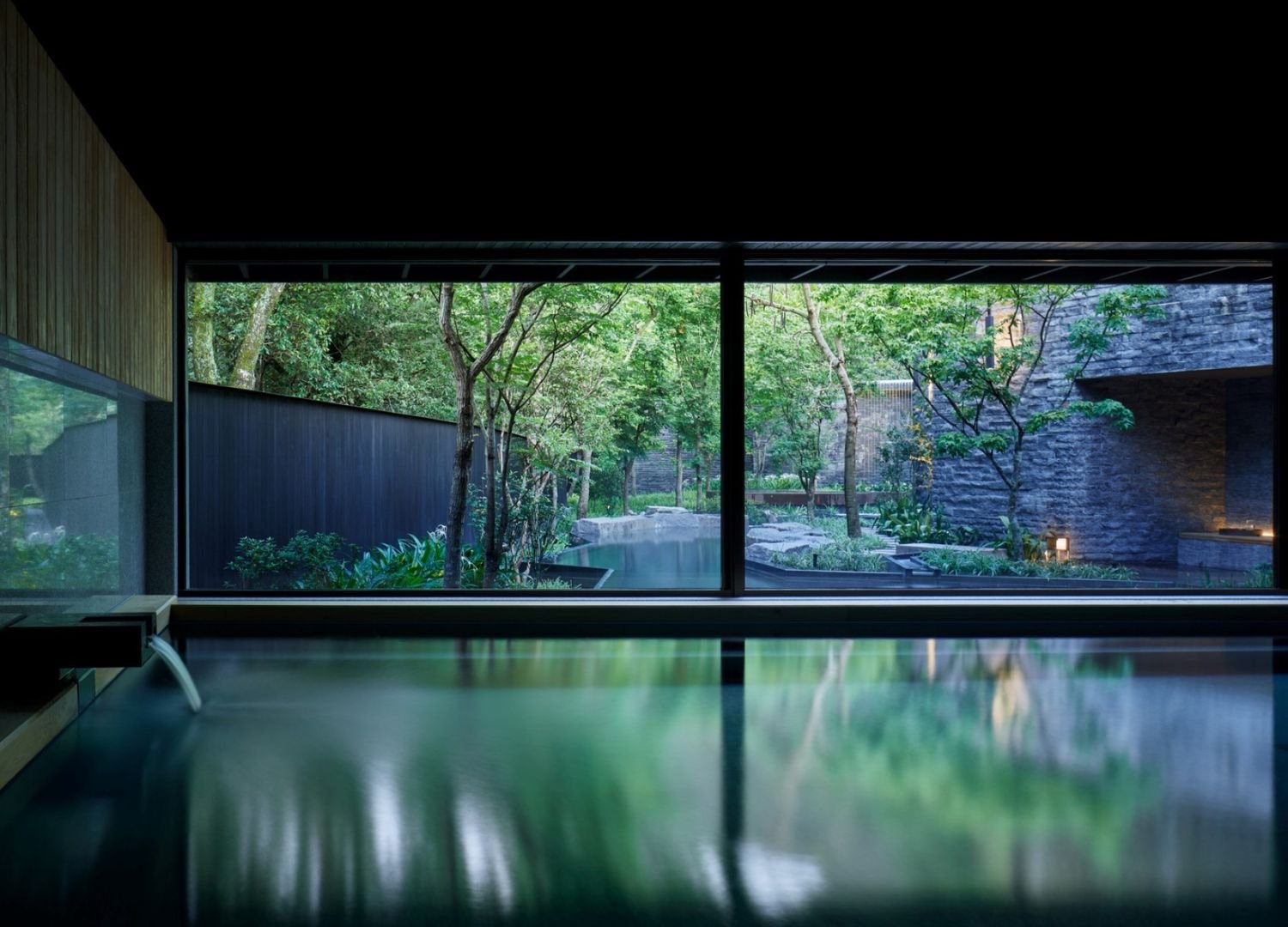 If the rooms establish privacy, the shared spaces articulate continuity. Here, water becomes an organising system. The public areas are designed around abundant hot springs and spring water flowing from the Xue Mountain Range, with a stable year-round supply. The property’s “Water Garden” concept is developed by environmental designer Hiroki Hasegawa: water flows from a waterfall behind the outdoor bath and a pond in front of the spa area, then weaves through bamboo groves and woodland. Seasonal plantings line the edges, and the sound of running water becomes an acoustic layer that guides movement, an environmental cue as much as an aesthetic gesture.