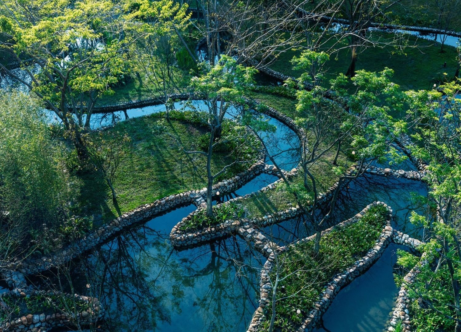 Opened in 2019, the project is introduced through a precise image: “a lofty pavilion woven from mountain streams” that functions less as a metaphor than as a design brief: spring water is channelled into architecture and landscape, creating a place that resonates with the rhythms of nature.