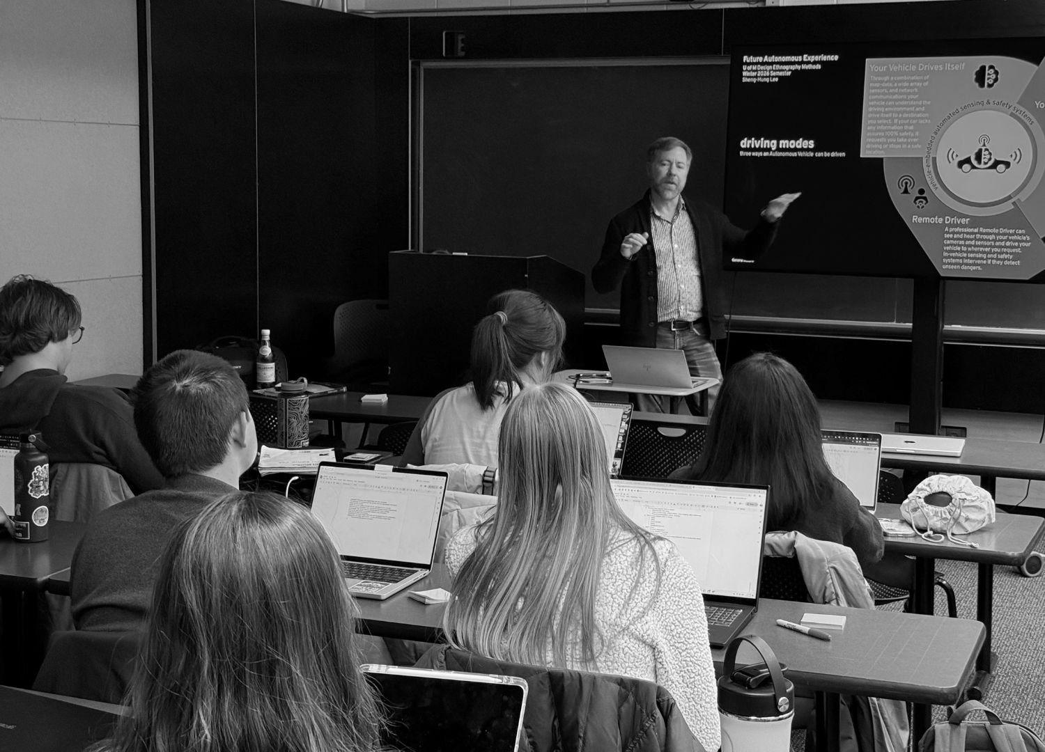 In UT210, students collaborated with GM to explore and envision future autonomous vehicle (AV) experiences (Figure 2). They practiced and applied semi-structured interviews, field observations, and photo diaries to understand participants’ perceptions, concerns, and aspirations about AV. Importantly, these design ethnography methods were not treated only as rigid procedures but as relational encounters.
