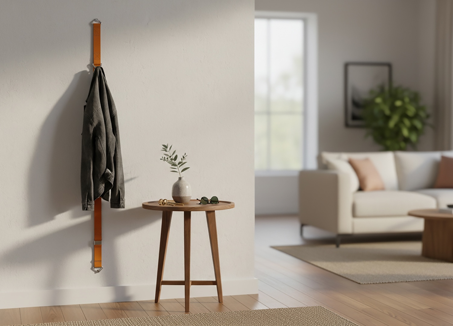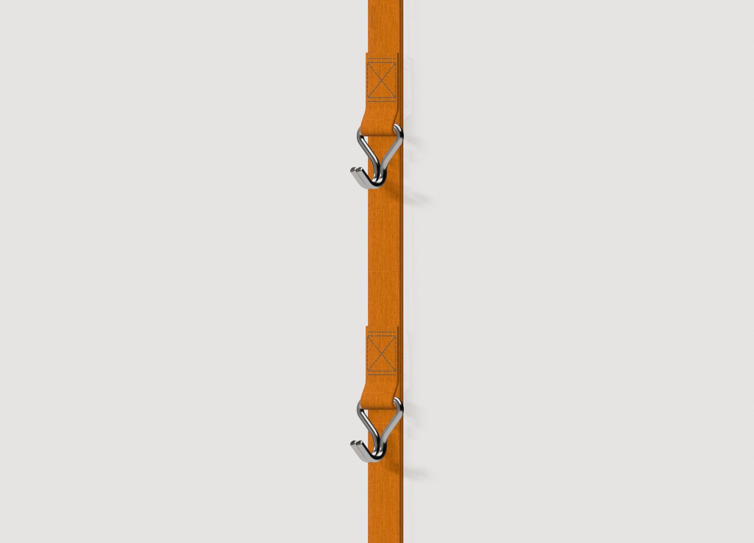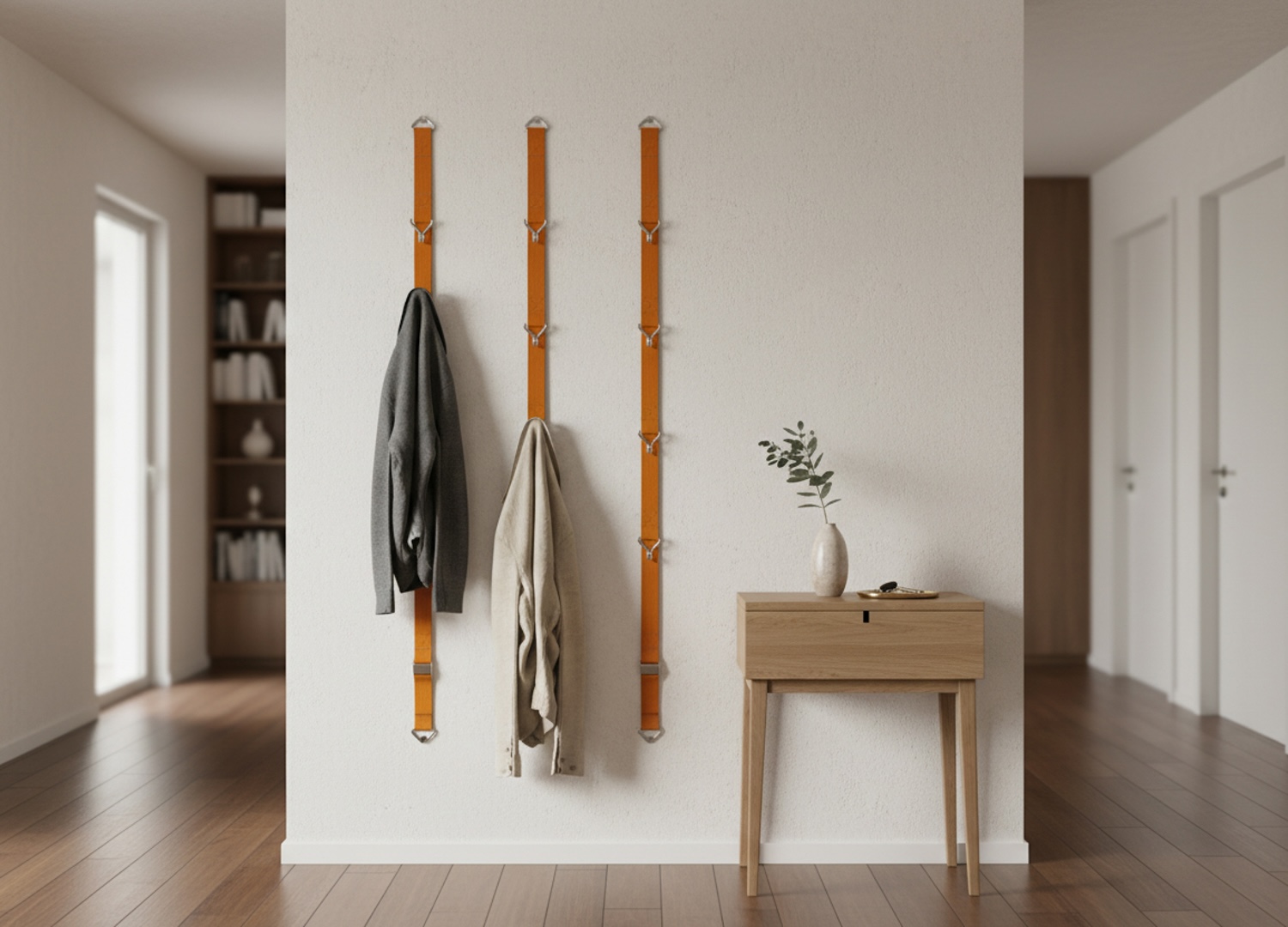 Ratchet straps already contain everything needed for multiple uses – hooks, loops, and a tensioning system – making them almost completely ready-made. Strap translates this industrial logic into a modular wall-mounted coat rack. Each unit consists of an orange nylon webbing strap, metal hooks for hanging objects, a self-locking buckle to adjust tension, and triangular metal rings that connect the system to the wall. These rings hook onto wall-mounted pins or screws, fixing the strap at the top and bottom while keeping it under tension.