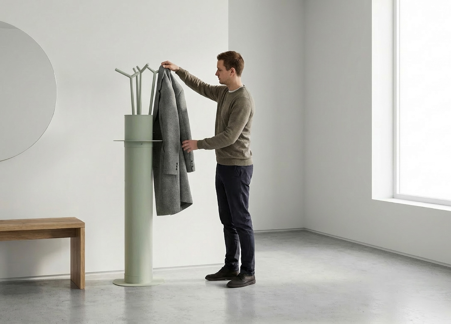 His approach was to add a new function – one that is both practical and playful. The form draws on a shared collective image: the tree. A central cylindrical element acts as the trunk, the main structural support. Inside it, removable sticks inspired by branches serve a dual purpose: they function as coat hangers, but can also be taken out and used as walking sticks when leaving the house.