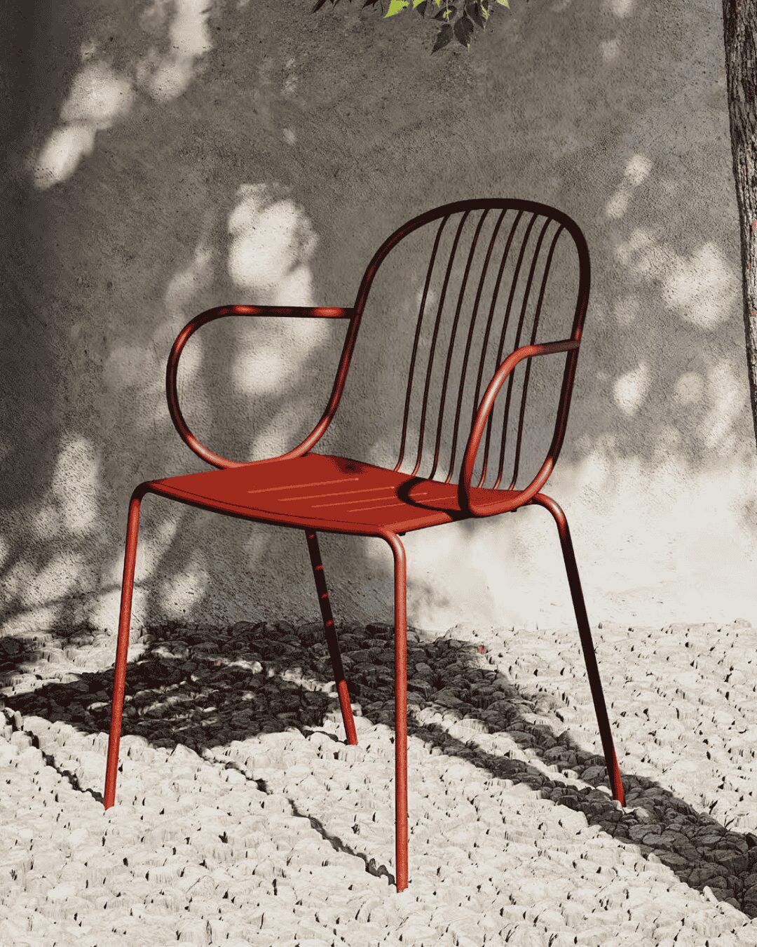 As the designer told us in a recent interview, “The idea was to revisit vintage French garden furniture – Belle Époque, Art Nouveau – and connect that language with industrial feasibility.” Available with or without armrests, Diane is designed for outdoor use but fits seamlessly into indoor settings as well. Its wide metal seat ensures comfort, while its stackability makes it ideal for Horeca and residential contexts. The resistant coating ensures durability, and an optional cushion enhances comfort without compromising its essential aesthetic.