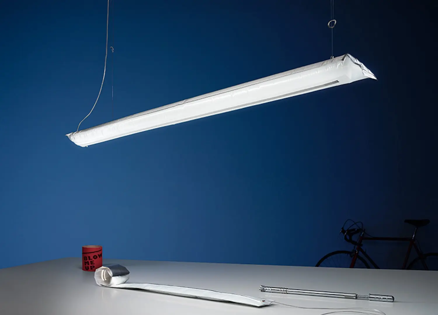A lamp that must be inflated by the user: Blow Me Up condenses Ingo Maurer’s experimental ethos into a single, explicit gesture. Delivered deflated, the luminous tube resists permanence and invites participation, with a new idea of what inflatable design is. Its flexibility allows it to lean, hang or sprawl, adapting fluidly to space and circumstance. The inflatable shell diffuses light evenly, tempering its industrial undertones. By foregrounding fragility, the piece allows air to become performative, turning lighting into an experience of temporary form.