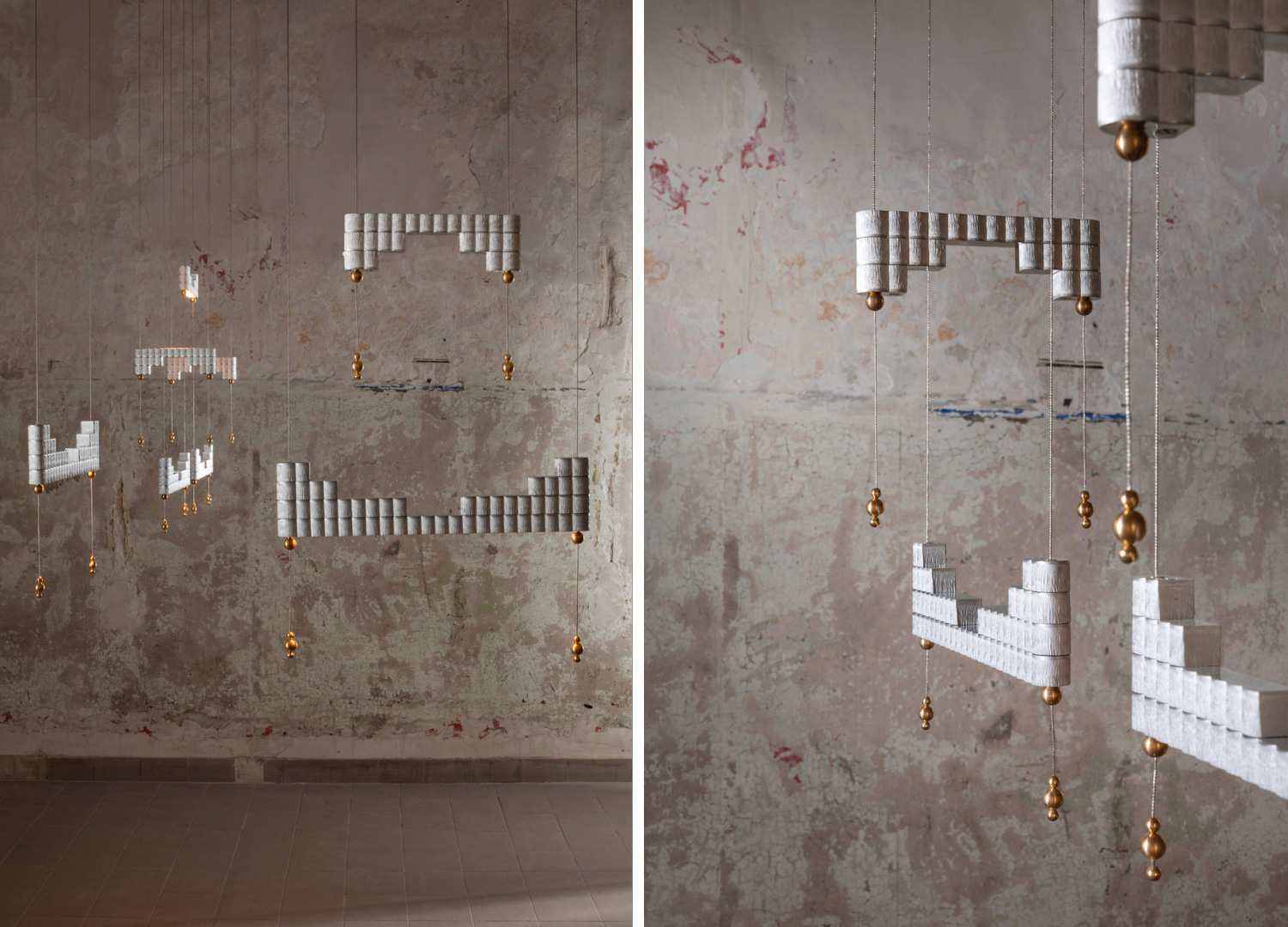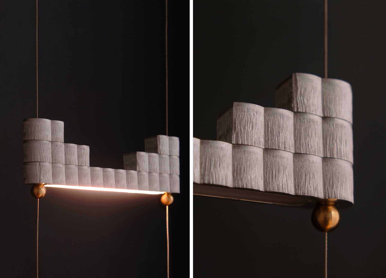 The inspiration, as mentioned, comes from Japan, specifically from ancient containers crafted by artisans during the Sengoku period (1467–1615). These were small cases made by stacking compartments held together at the ends with a bead (ojime) and two passing cords. Traditionally worn at the waist and used to carry personal items, over the centuries, they evolved into collectible objects, and, in the hands of Atelier Nuanda, into a suspended modular lamp.