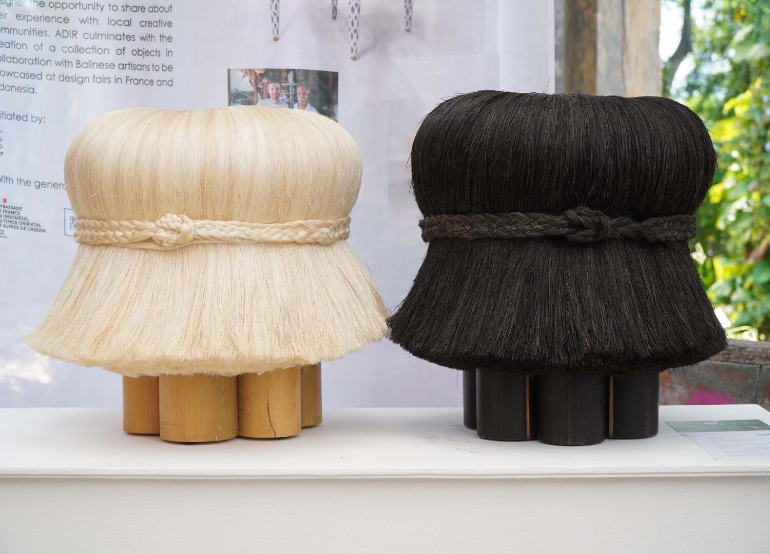 CushCush Gallery acts as a meeting point between international creatives and the Balinese community, encouraging collaborations that highlight local craftsmanship while opening space for contemporary experimentation. At this edition, the gallery showcased a selection of pieces developed over the years, including the Rambut stools by Pierre Charrié. The pair plays with contrast — soft and coarse, dark and light — echoing the Balinese concept of Rwa Bhineda, which sees harmony in opposites.