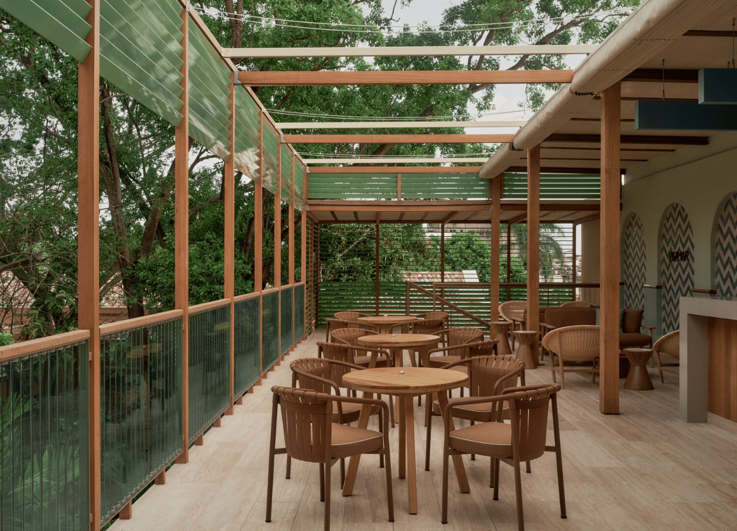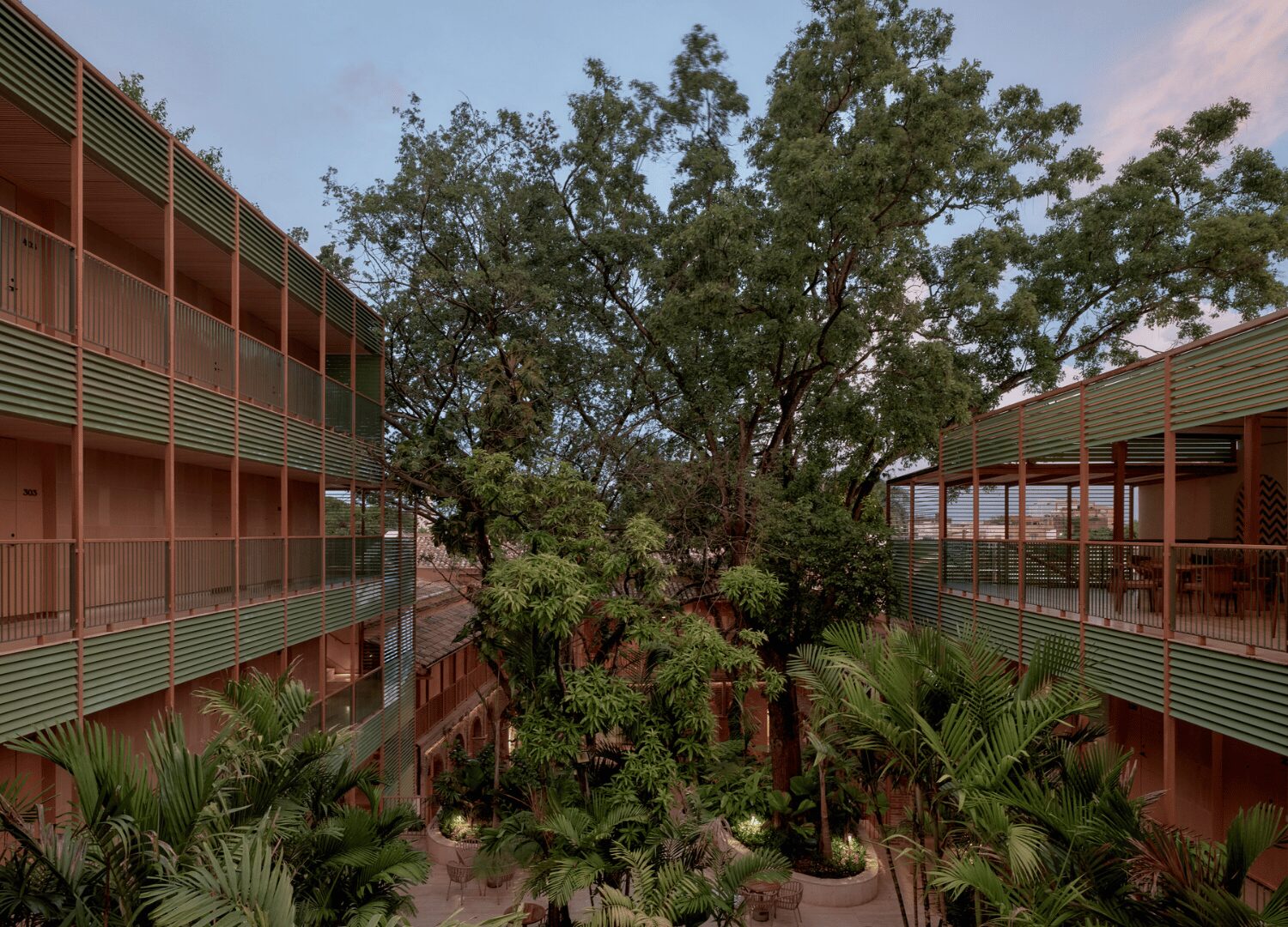 Once inside, the large central courtyard, a key element of the original structure, becomes the heart of the hotel and a link to the area’s colonial heritage. The layout of the local vegetation and lateral corridors maximizes natural light and ventilation. The lower part of the courtyard has a more historic character, with a small portico separated by brick arches and a wooden balcony with traditional geometric patterns.