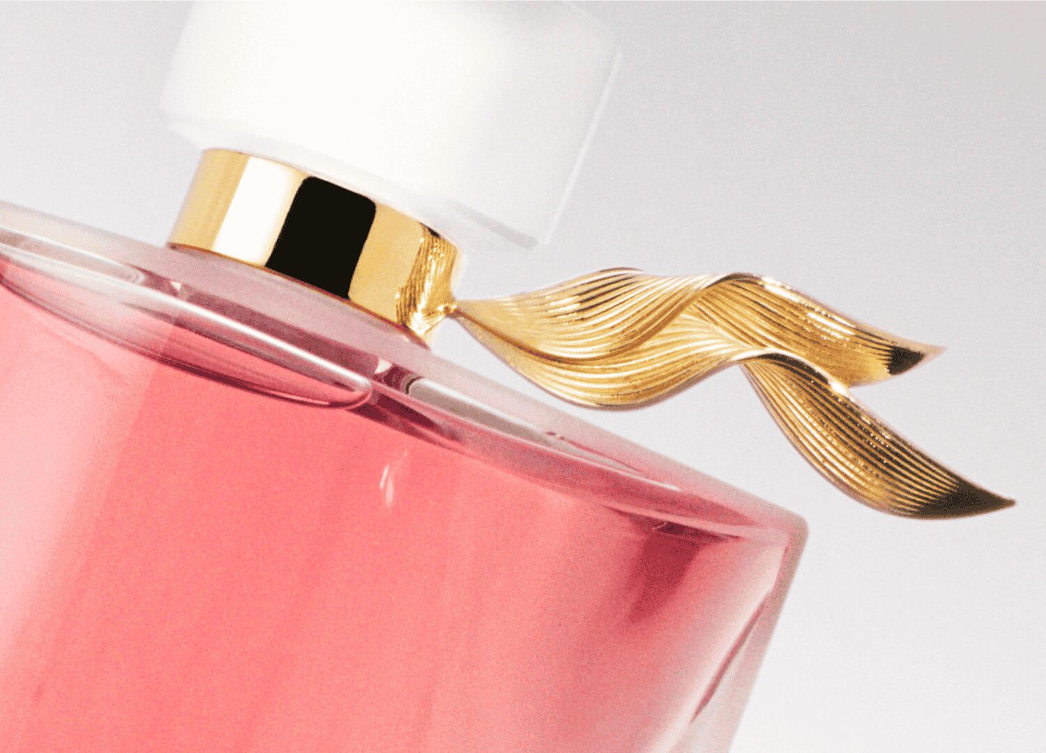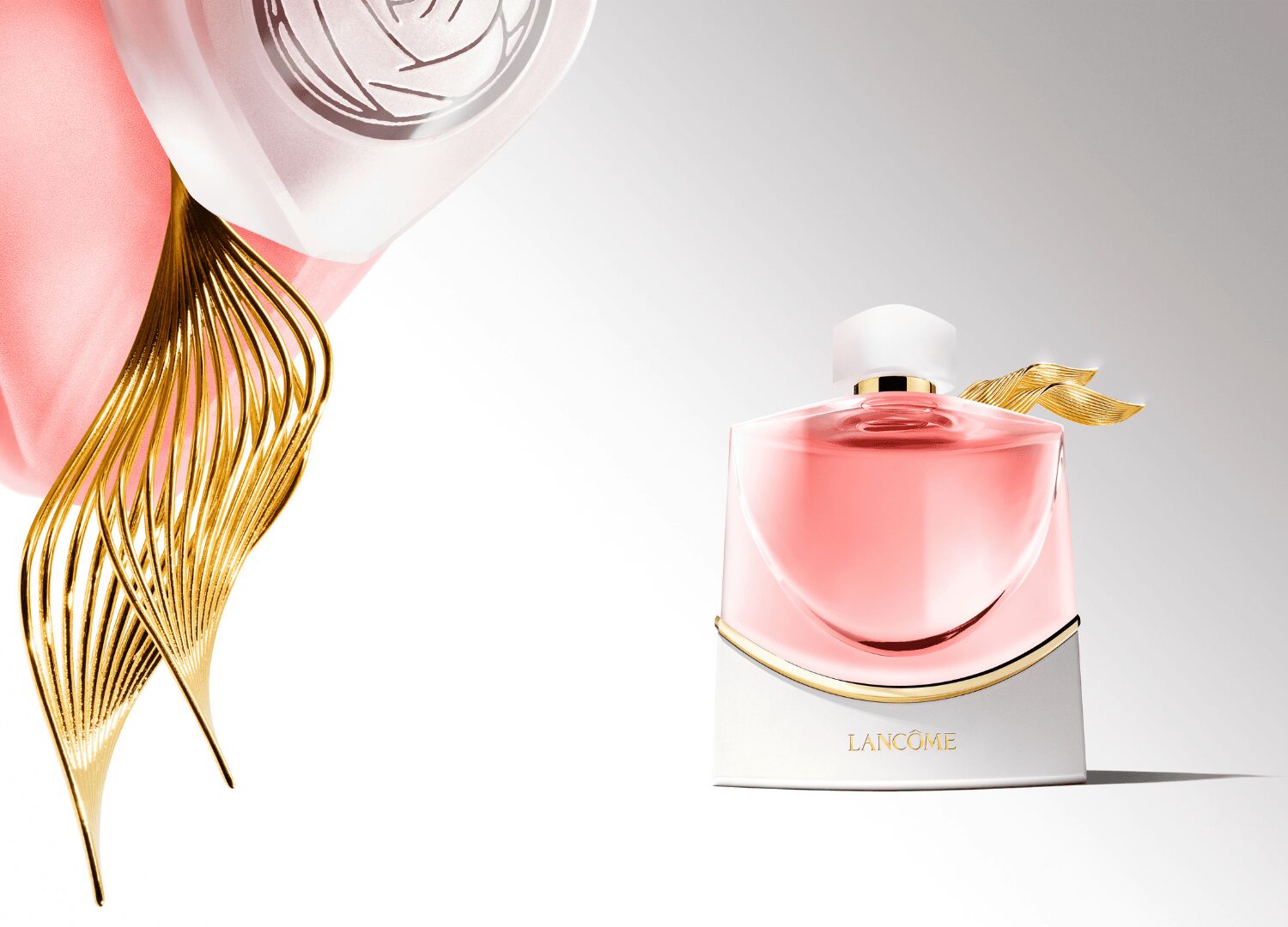 Looking at the individual products, the crystal bottle of La Vie Est Belle Eau de Parfum rests on a pristine white ceramic base decorated with Lancôme’s iconic Agora Rose motif in shining gold. When lifted, the curved base allows the bottle to “dance” on any surface, playfully embodying the joy that the fragrance represents. The distinctive crystal smile of the bottle is reinterpreted as a curve, while the pleated gold ribbon wings become a symbol of elegance that suggests movement.