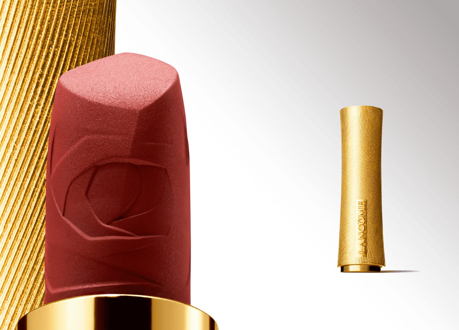 The curves, cuts and proportions of the previous two pieces also return in the Absolu Rouge lipstick. Clad in Versailles gold, it is sculpted by hand in an elegant, sculptural form with smooth lines and the Rose motif placed on the top of the case. The tactile “click” of the ceramic button opens the case, while the lipstick bullet is also engraved with the Rose motif, underscoring once more Lancôme’s 90 years of exploration and research.