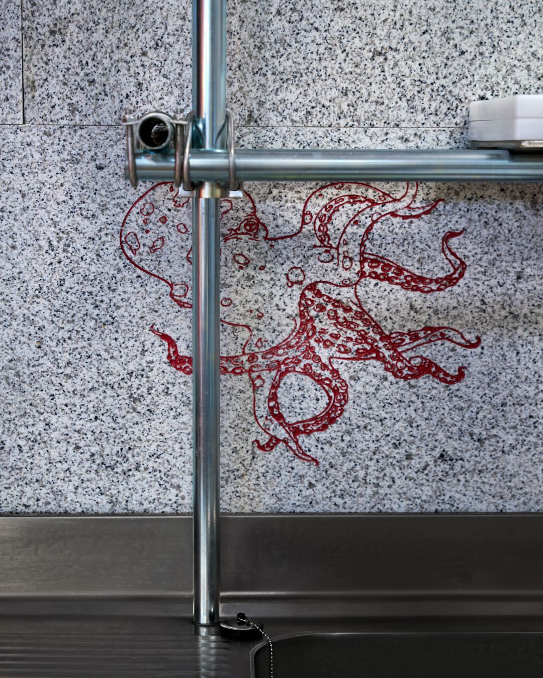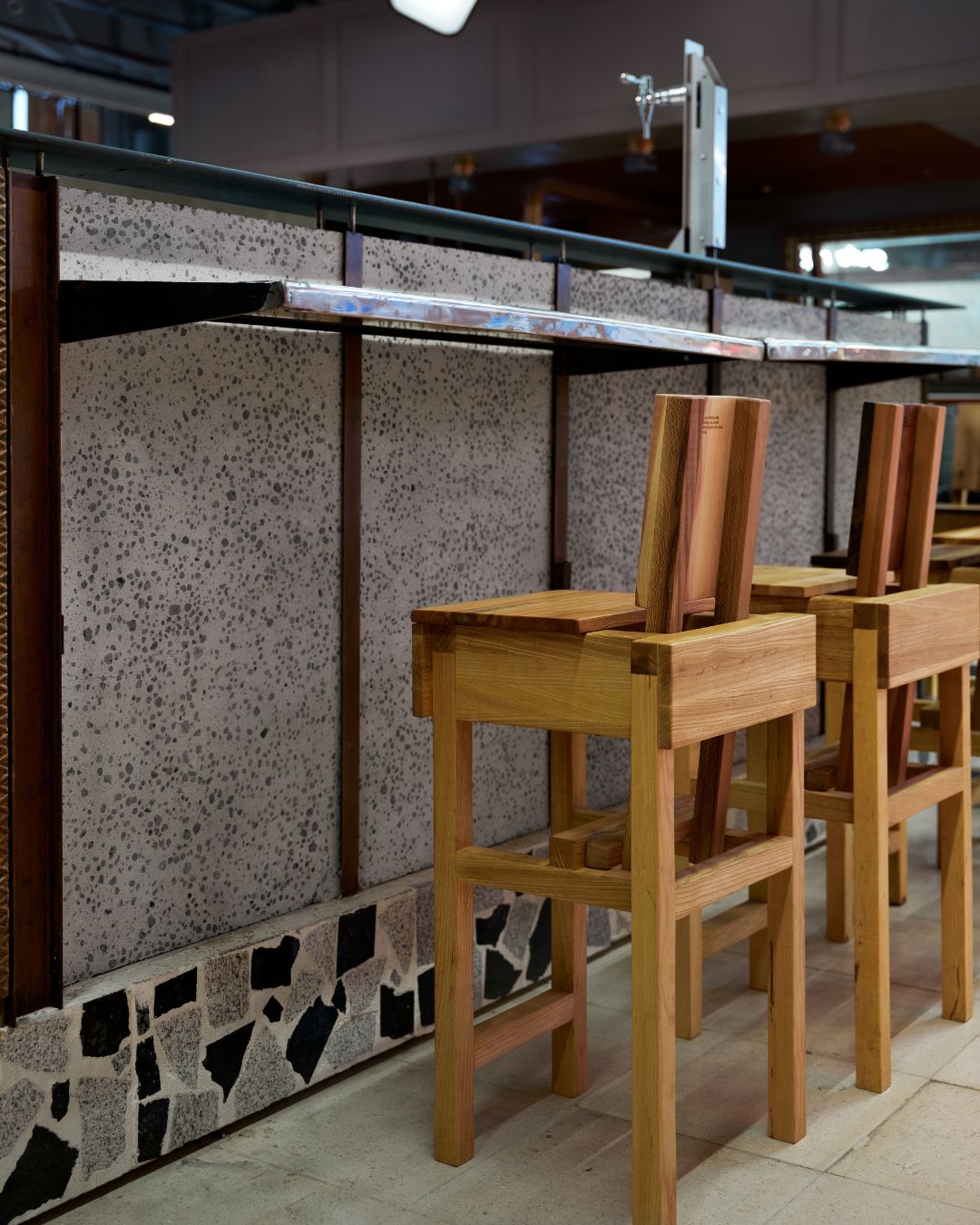 The designer’s latest project is El Puesto Guía Repsol, a pop-up gastronomic platform commissioned by Guía Repsol, a Spanish travel and food guide. Occupying a former fishmonger’s stall in Madrid’s Mercado de Vallehermoso, the space is a feat of compact invention: almost nothing was sourced new, all materials have been repurposed. The soul of the old stall, what Lucas calls El Pulpo Inmortal, lingers in the logic of the design, which was unpretentiously built around what was there and what was asked for.