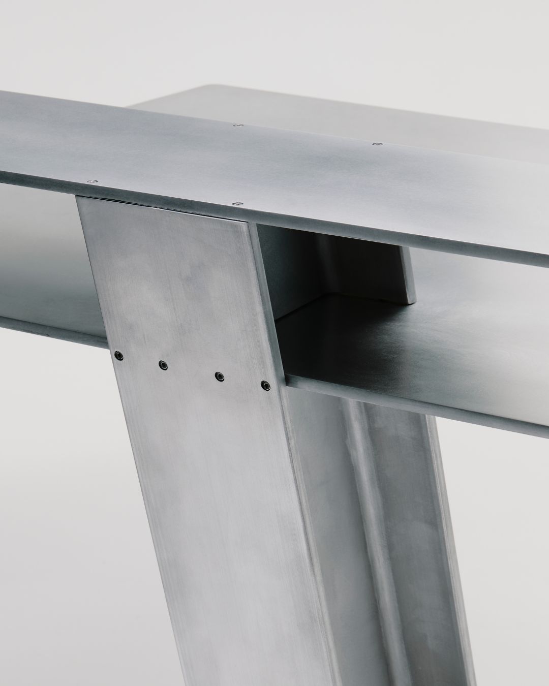 At the heart of Williams’ collection is a design philosophy rooted in standardisation, using a single industrial component as the foundation for an entire furniture system. The I-beam was patented in 1849 by Alphonse Halbou, refined over nearly two centuries of industrial production, and it represents the apex of standardised structural efficiency. Williams’ work subverts its usual use, transforming it instead into a means for creativity and self-expression.