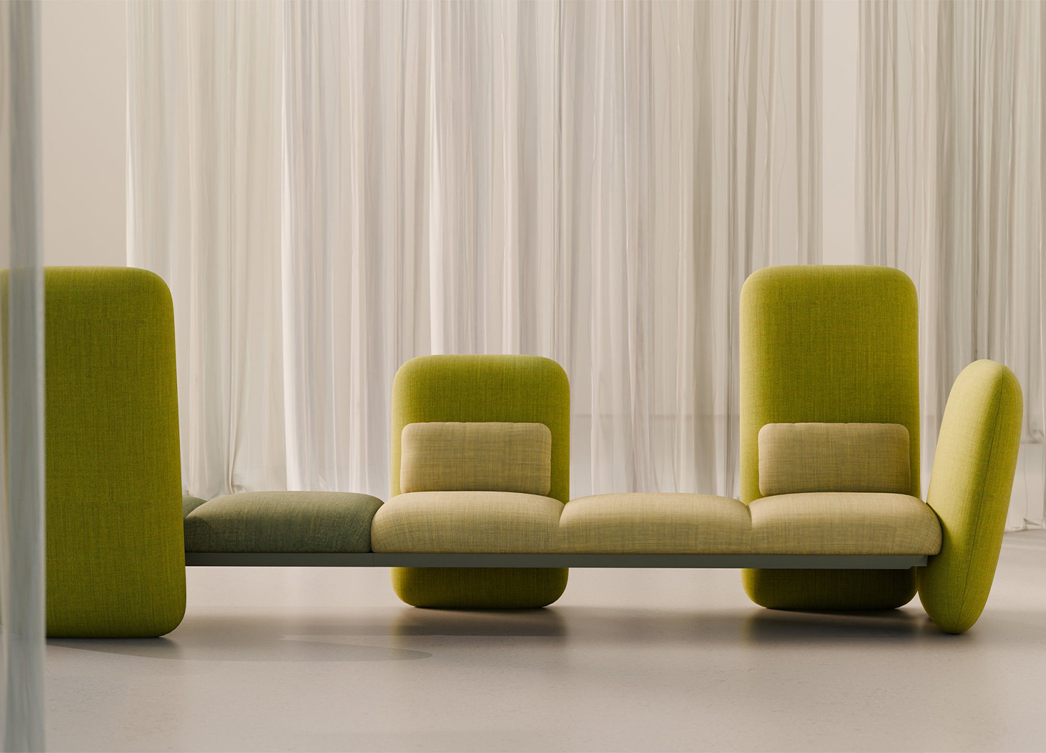 The conceptual heart of Metric lies in connection—between people, between environments, between spaces. Its most defining feature is the vertical panels of varying heights attached to the backrests and armrests, generating a sculptural visual rhythm. More than decorative, these panels serve as soft dividers, organizing micro-environments and offering gentle privacy without rigidity. Thus, the system assumes an architectural role while maintaining fluidity and approachability—a visual grammar of volume and voids, intended to enable dialogue through space. Every line, every gap, every module participates in a silent choreography of presence and openness.