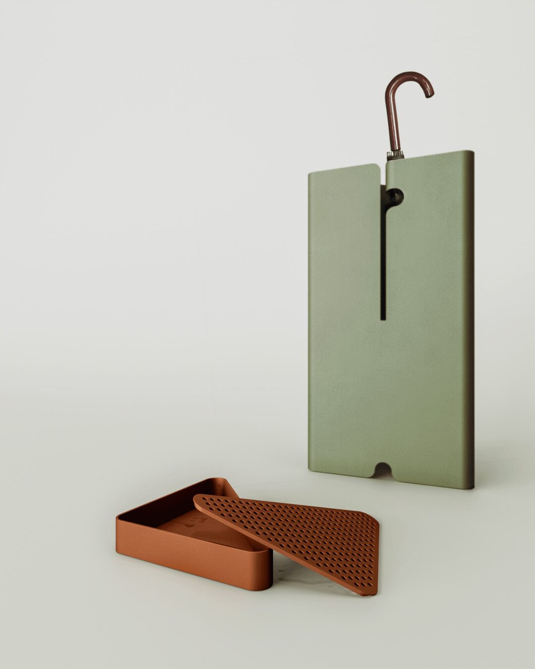 At the base, a removable tray in a different color from the upper volume features a perforated metal plate that collects excess water, keeping the interior clean and dry. A cutout with a recess at the bottom of the main element reveals the tray underneath and allows for easy disassembly of the parts, while also visually lightening the visual impact of the product. The same cut is present on the back of the umbrella stand and functions as a handle for transport. All connection points and details have been designed to maximize structural strength and maintain formal coherence.