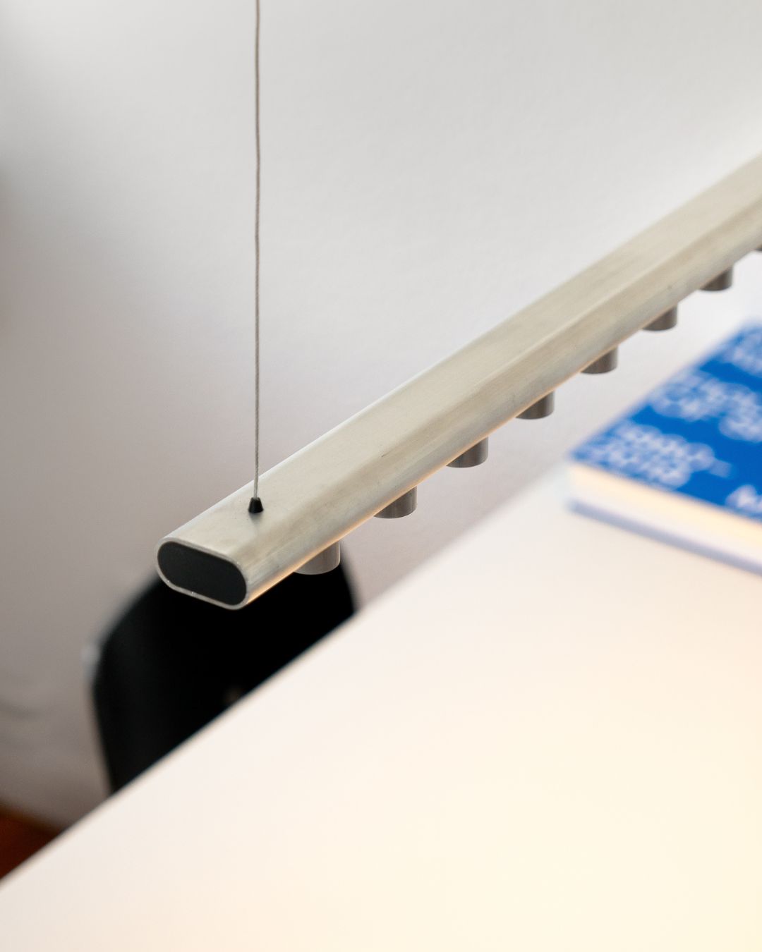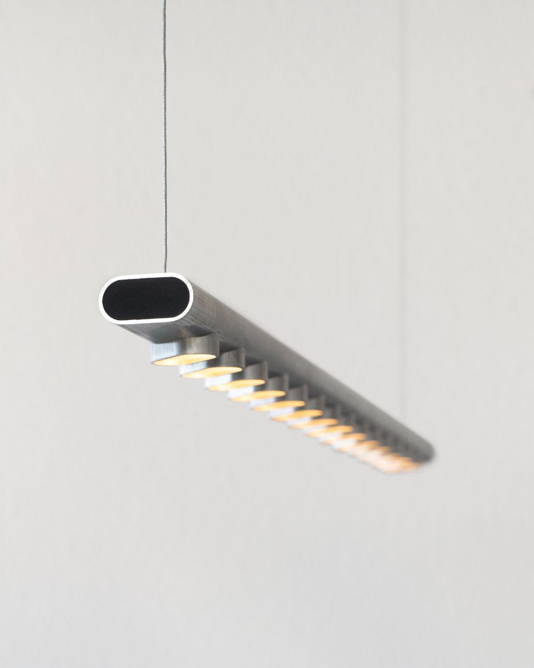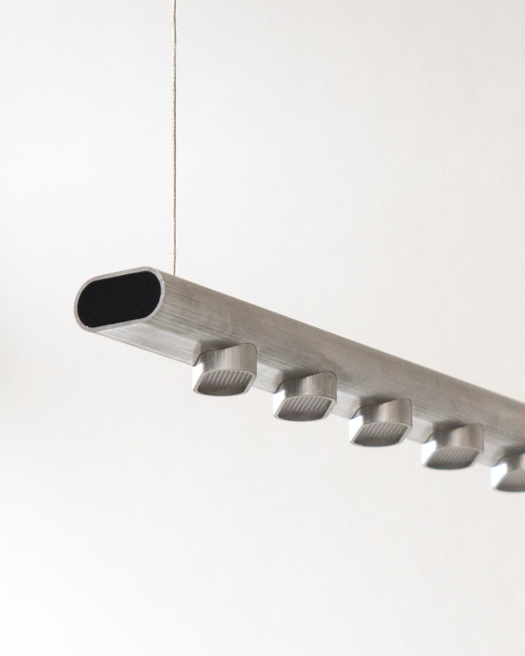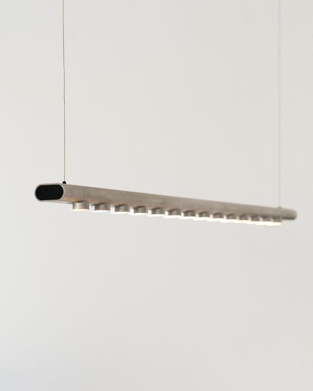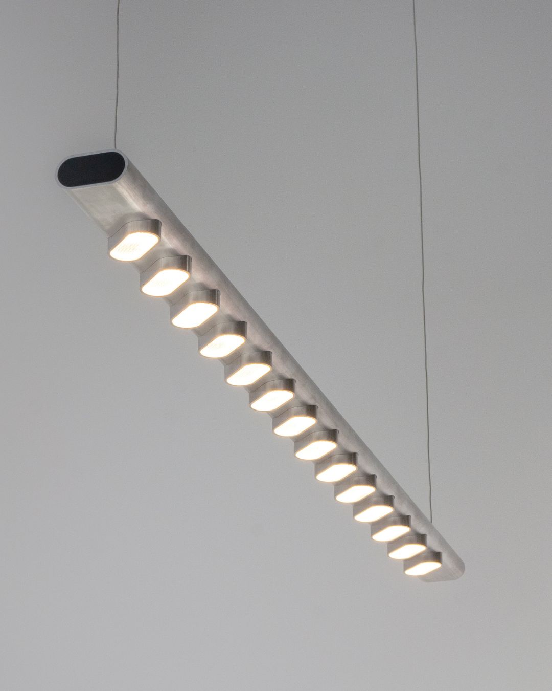 What characterises Norm is its materiality, as the product is an exploration of how a single aluminium profile could serve as the foundation for an entire lighting system. A long extruded profile is cut into the different components of the lamp, mainly into the 94 cm horizontal structural bar and 14 small inserts for the LED lighting, which are then inserted and welded into the bar. By using just one standard aluminium extrusion for all basic components, Norm achieves a simplified production system with minimal material waste.