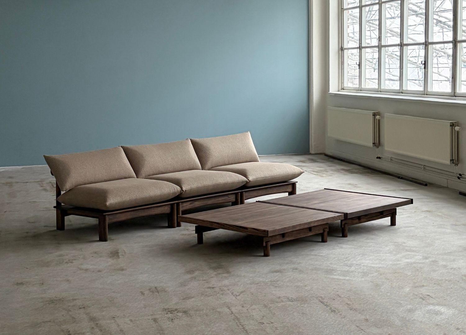 Produced entirely in Norway, the collection includes modules from the Tide sofa system upholstered in Kumo, Kvadrat’s newest textile collection, Atrium lounge tables and Hollow table lamps. Crafted from solid oak with a dark pigmented linseed oil finish, the pieces share a restrained material language. Soft curves, shallow arcs and architectural volumes are balanced with sharper details, resulting in furniture that feels both grounded and contemporary.