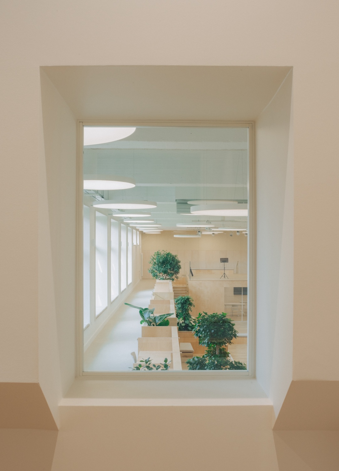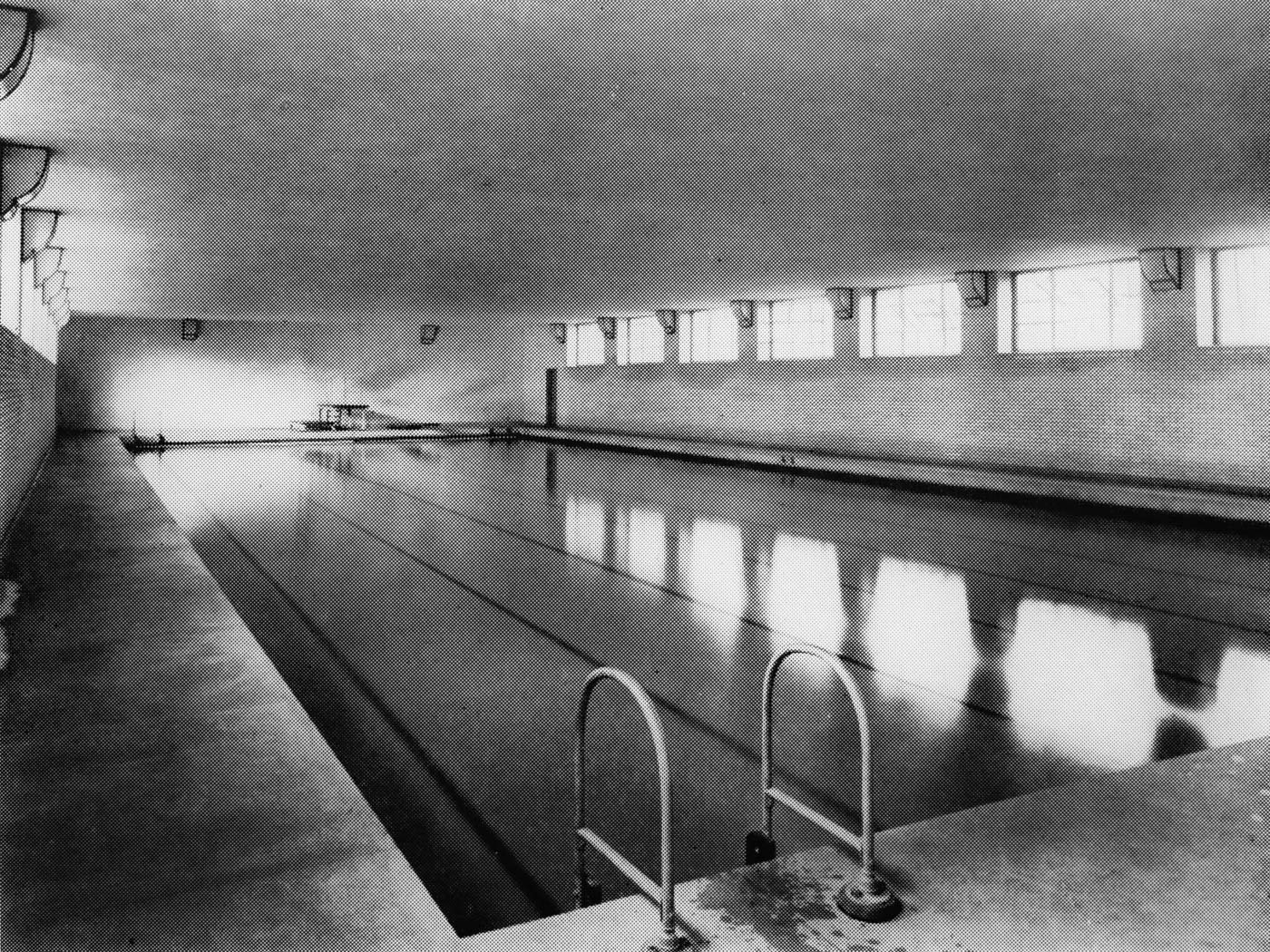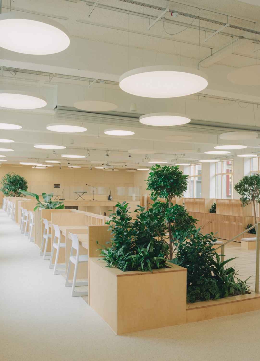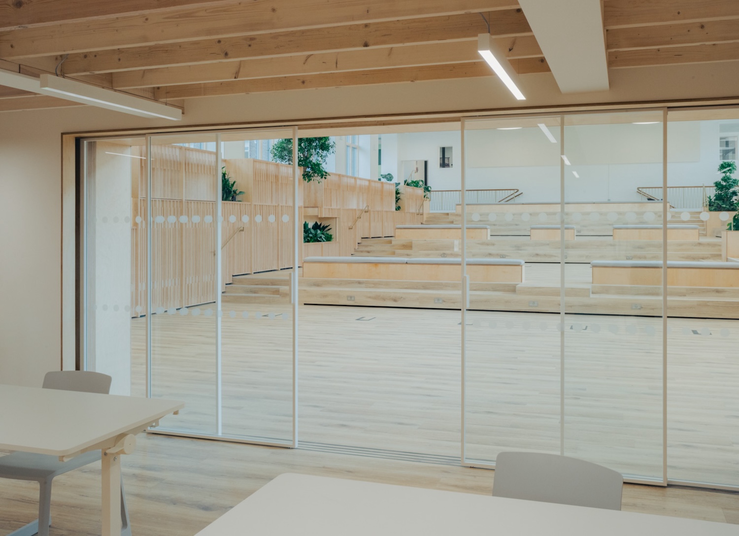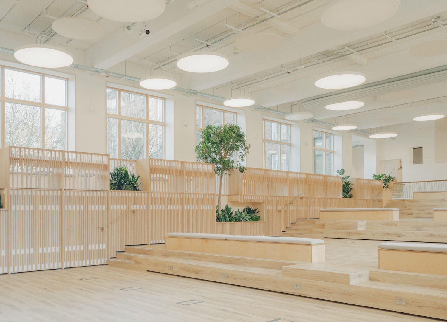 The material strategy reinforced this sustainable approach. Extensive thermal upgrades included high-performance insulation throughout the existing envelope, while triple-glazed windows maximized natural light without sacrificing energy efficiency. The retention of the pool’s structural framework – its concrete shell and distinctive spatial volumes – meant thousands of tons of embodied carbon remained in place rather than being demolished and replaced. New interventions employed low-carbon materials where possible, with timber elements for the multi-level stage and adaptable furniture systems that could be reconfigured rather than replaced as needs evolve.