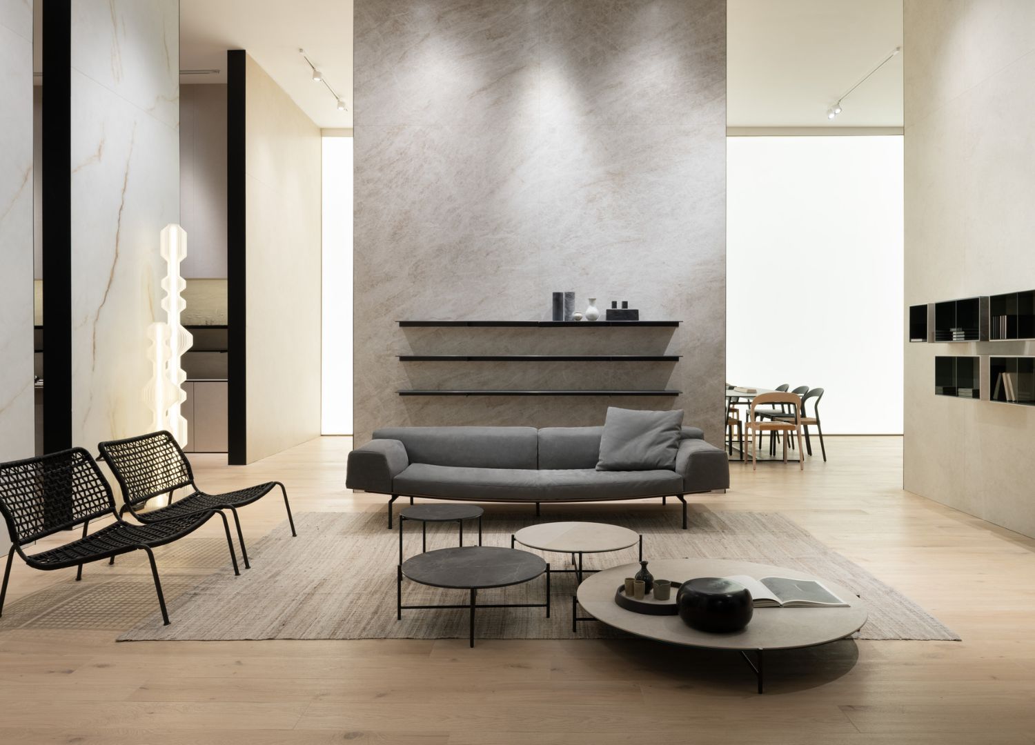 The storage line includes Libra, a multifunctional console with glass and mirrors; Torre, a shelf and storage element; and Omega shelves, which are designed as complementary elements to the other pieces, in line with the One Space philosophy. The accessories feature Quadro and Disco, serving trays which combine porcelain stoneware with solid ash wood frames; Trama, a minimalist centrepiece; and Filo, a cake stand that can also be a serving tray.