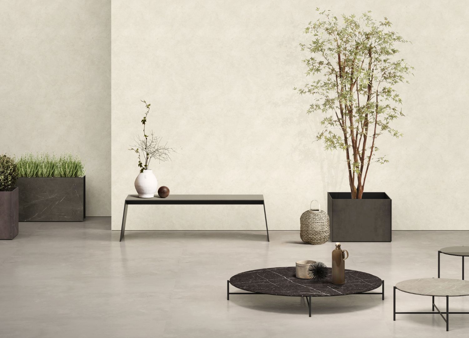 The collection is divided into three main categories: furniture, storage and displays, and home accessories. The furniture line stars Giotto, a table that combines porcelain stoneware tops with glass structures, designed for indoor and outdoor use. Arco is a bench made from bent and painted aluminium with external porcelain stoneware covering. The Hashtag planter uses a welded and painted metal frame covered with 6mm porcelain stoneware.