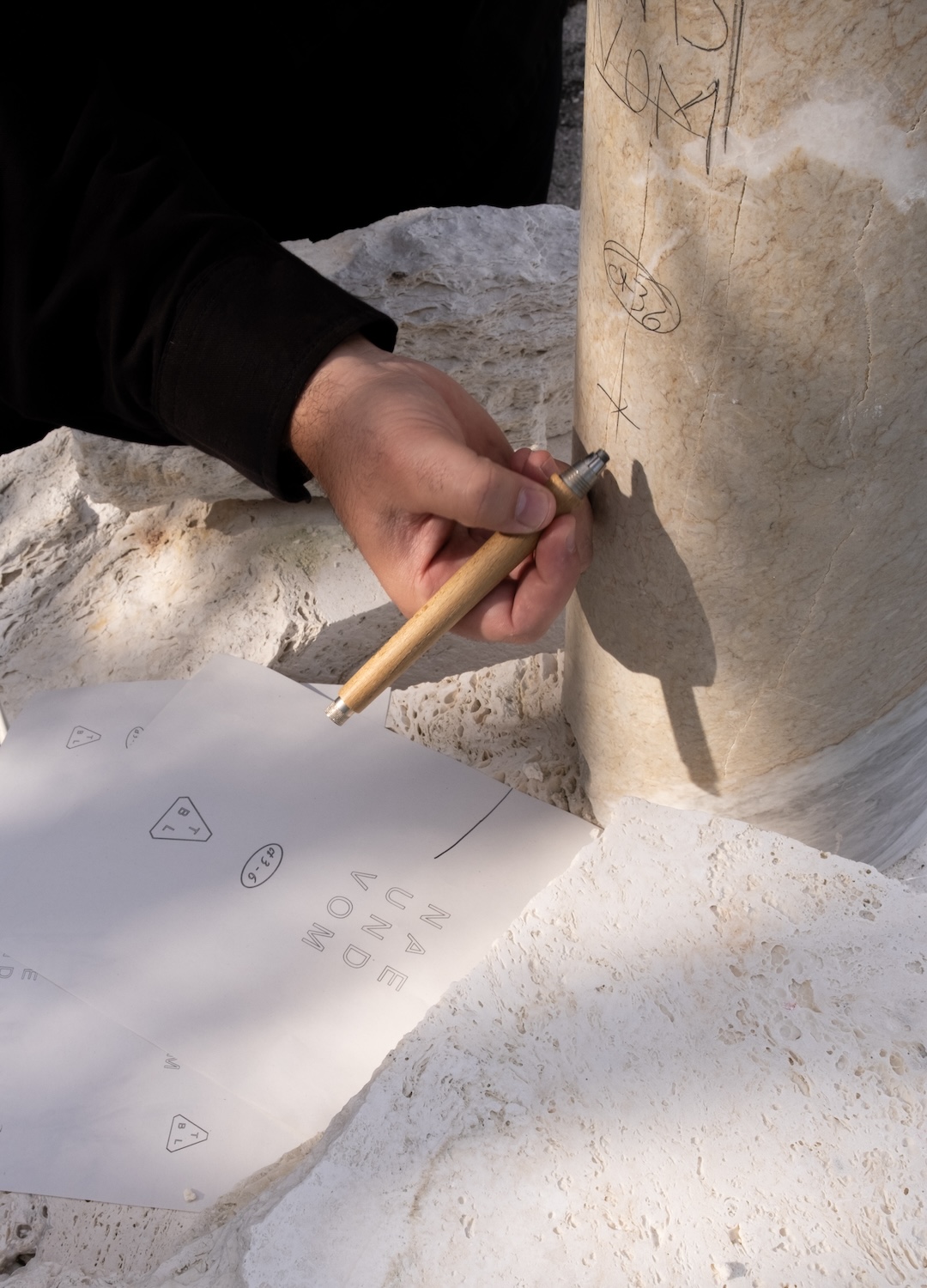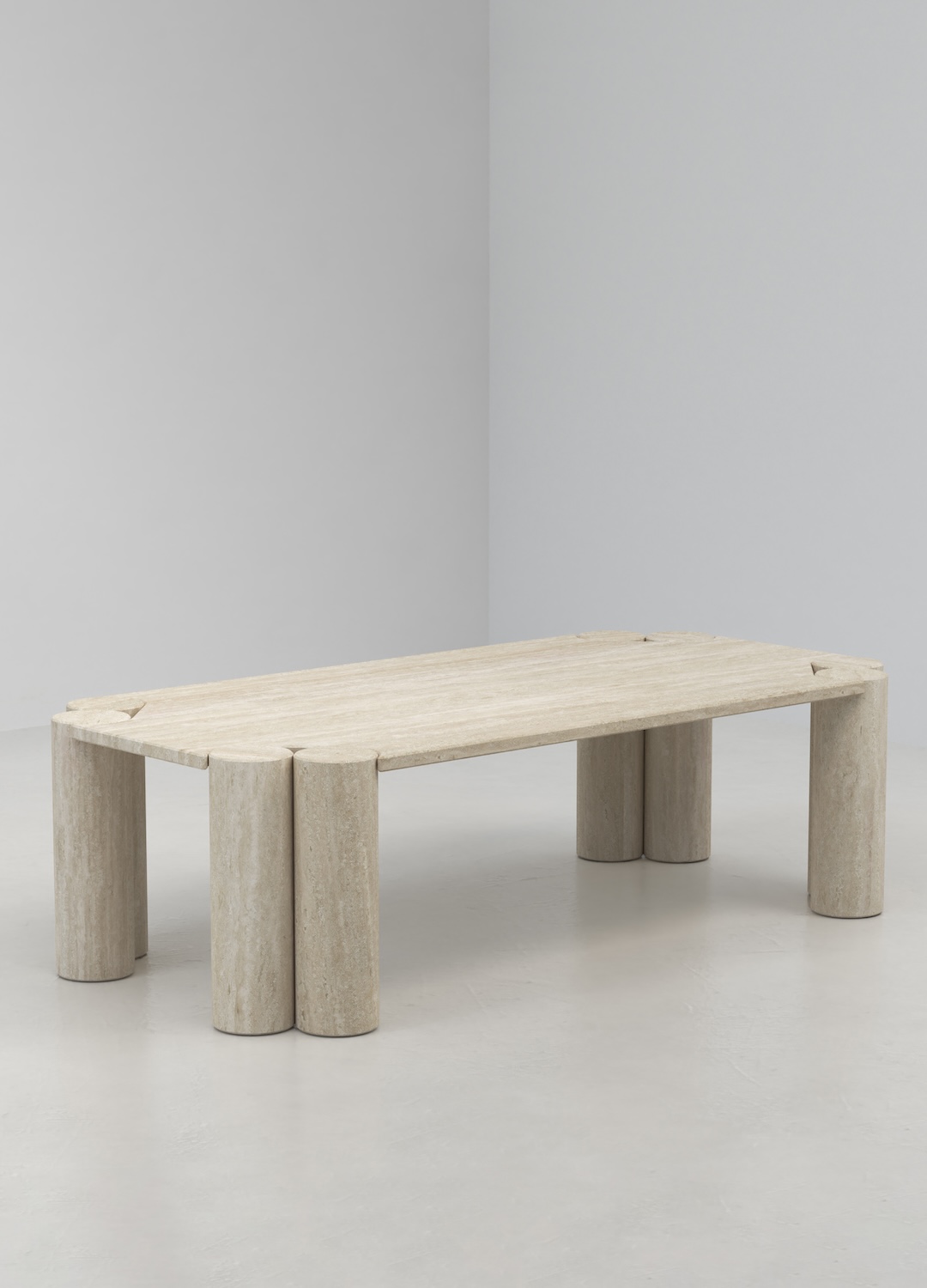 It’s a “deodorised” travertine: it loses its warm, decorative quality and becomes almost neutral. It’s a Roman material stripped of its rhetoric. This allows us to work with pure form, without the material imposing a predefined reading. White travertine sheds its warmth but gains a neutrality that leaves space for formal narration.