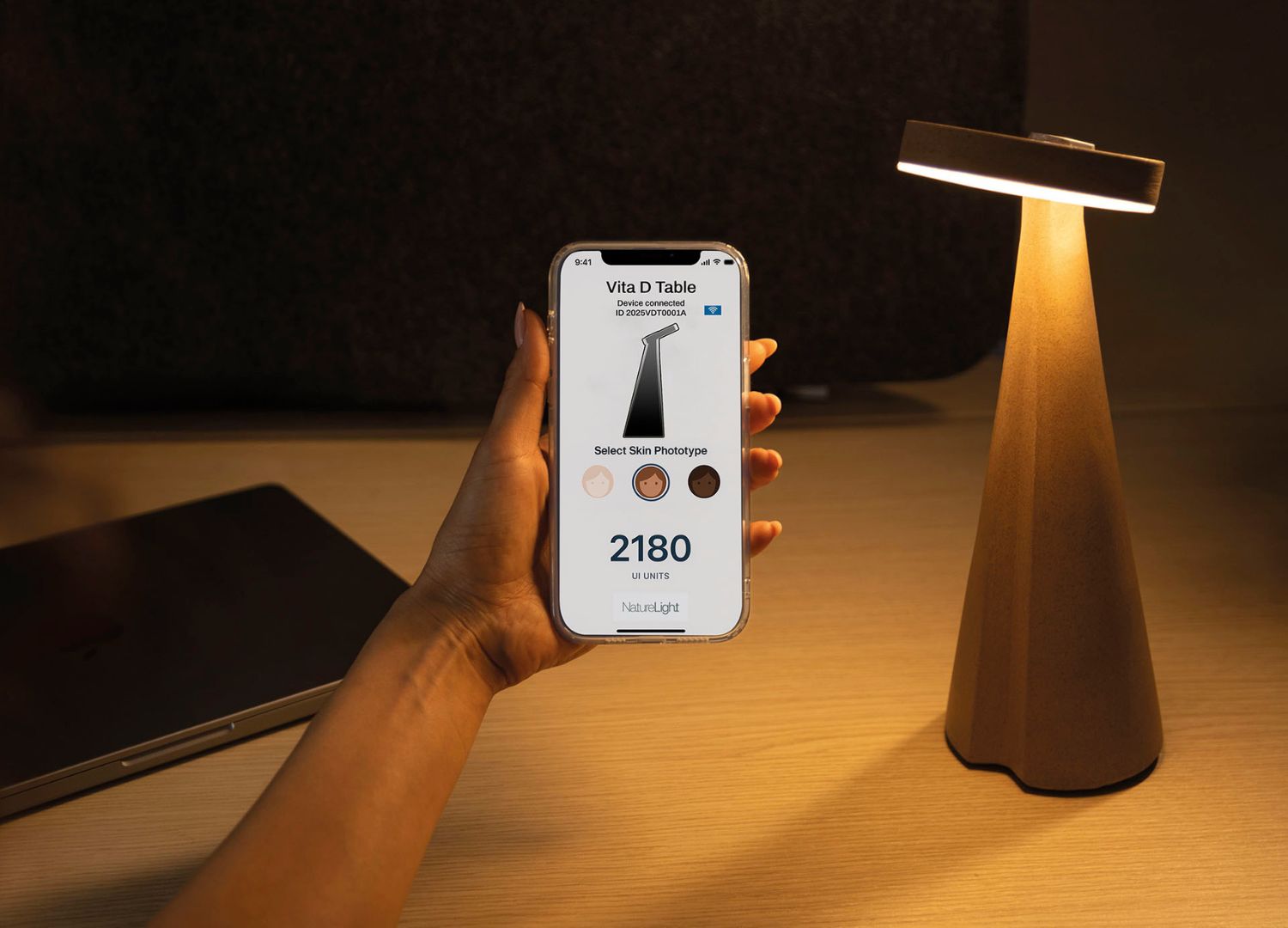 Meet the Vita D Table lamp by NatureLight: a smart wellness device that helps your skin safely synthesise vitamin D, thanks to controlled UV light. Rethinking what lighting design can be, starting with health.