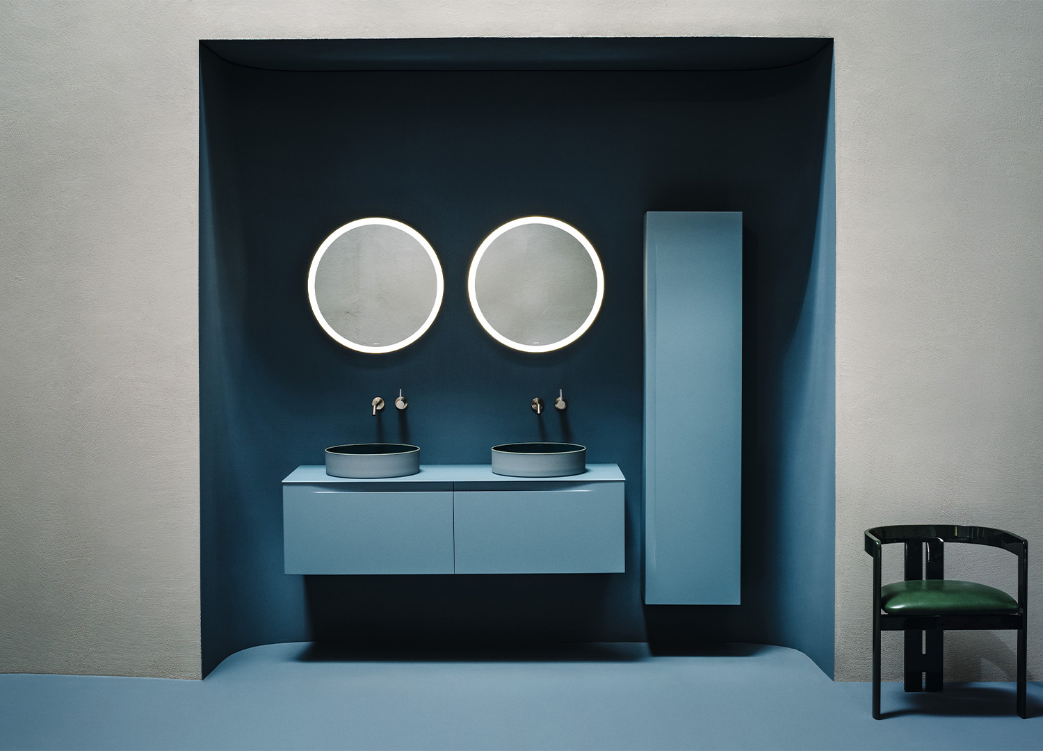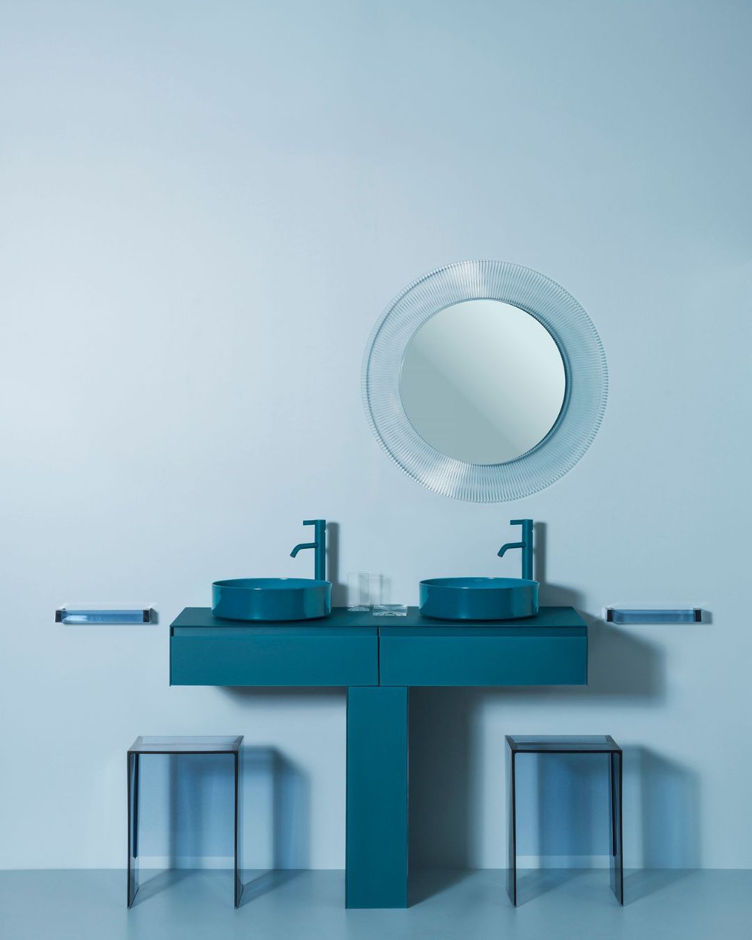 Central to this evolution is the introduction of VITREON, which expands the expressive potential of the collection, particularly in terms of colour. Yet the transformation goes beyond material. Pieces such as beauTwash, with its distinctive T-shaped structure, challenge the traditional definition of bathroom furniture, assuming the presence and identity of domestic furnishings. Similarly, the reinterpretation of Kartell’s iconic Componibile as a column washbasin introduces a dialogue between design history and contemporary use.