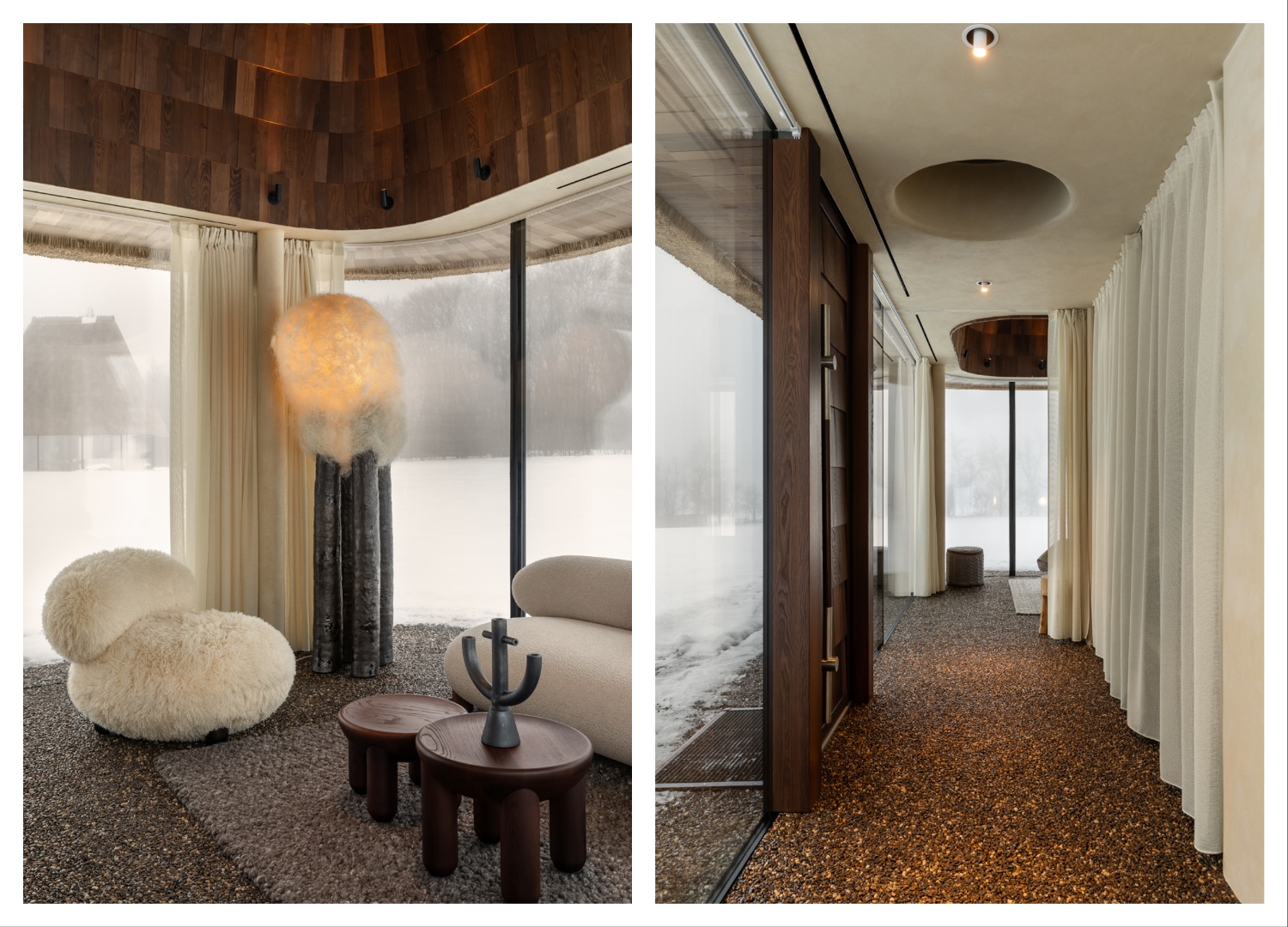 Furniture and objects – from Noom seating to black clay decorations by Guculiya, along with handcrafted lamps in ceramic and natural fibres – complete an eco-minimalist and tactile interior. A restrained colour palette and textured surfaces help create a calm environment that feels coherent with its surroundings. For additional privacy, automated curtains can be drawn without compromising the outward views.