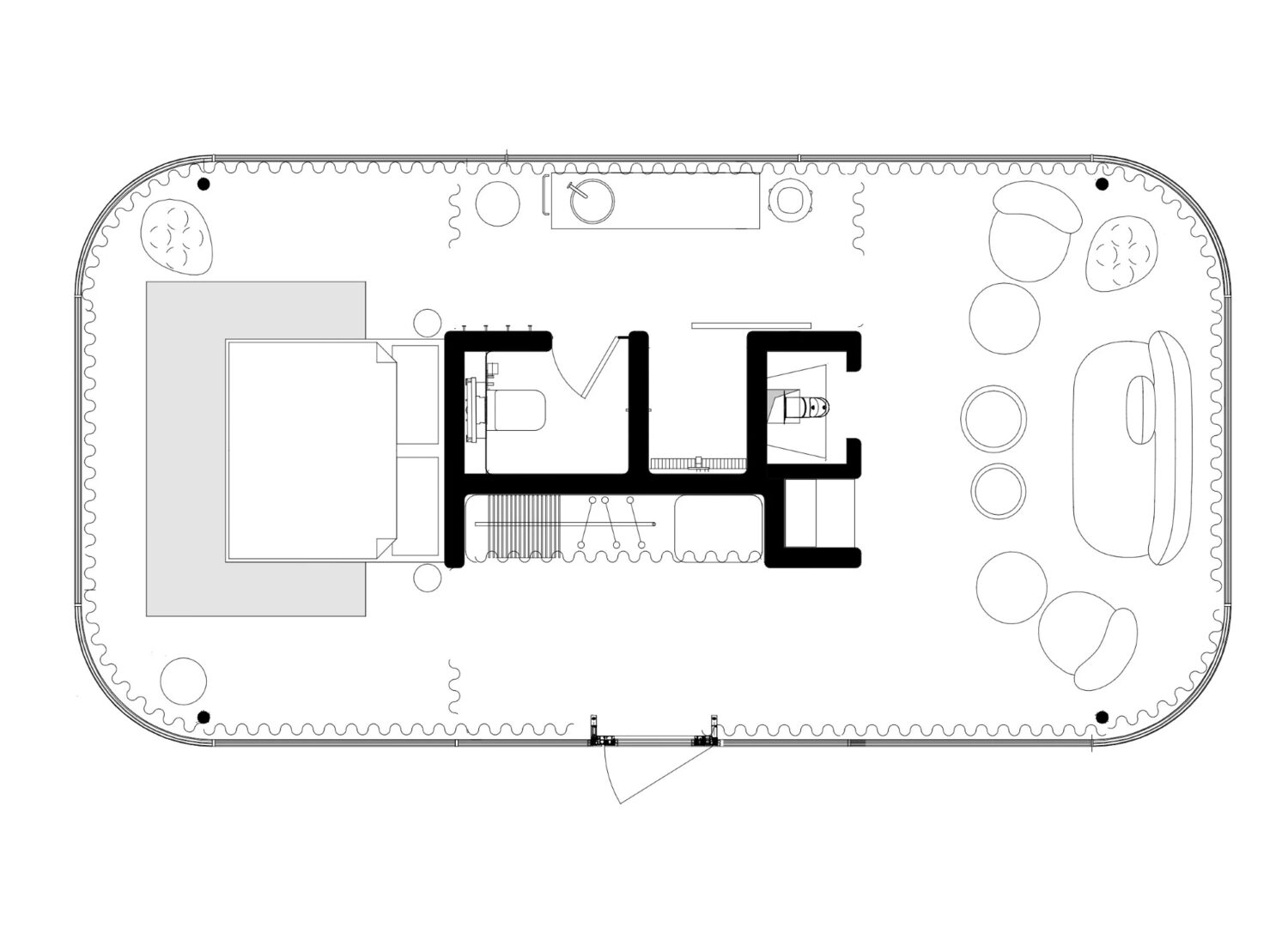Inside, the layout revolves around a central concrete core that contains the bathroom, with the bedroom and living area positioned on either side, all defined by an essential and understated atmosphere. Here, a minimalist circular fireplace serves as a contemporary reinterpretation of the traditional Ukrainian stove – the heart of domestic life – and defines the space while encouraging relaxation. Materials also echo local tradition, such as the polished stone flooring that extends seamlessly from interior to exterior, reinforcing a sense of spatial continuity.