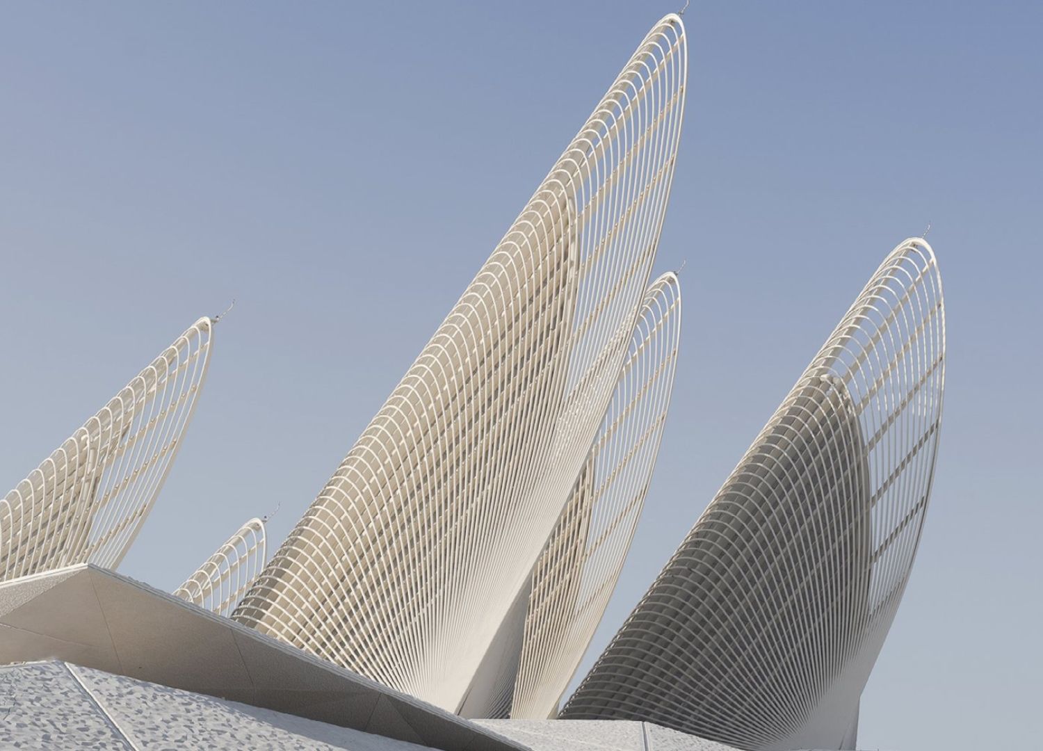 The primary galleries of the museum nestle in a massive mound, whose giant textured panels reference the topography of the UAE itself. Rising from this mound are five lightweight steel structures that give character to the architecture. Inspired by the falcon, a central animal to Gulf culture, the towers are aerodynamically sculpted to reference the bird’s wings during flight. However, this poetic reference also has a practical purpose, as the towers work as solar thermal chimneys, using the region’s intense heat to naturally ventilate the building.