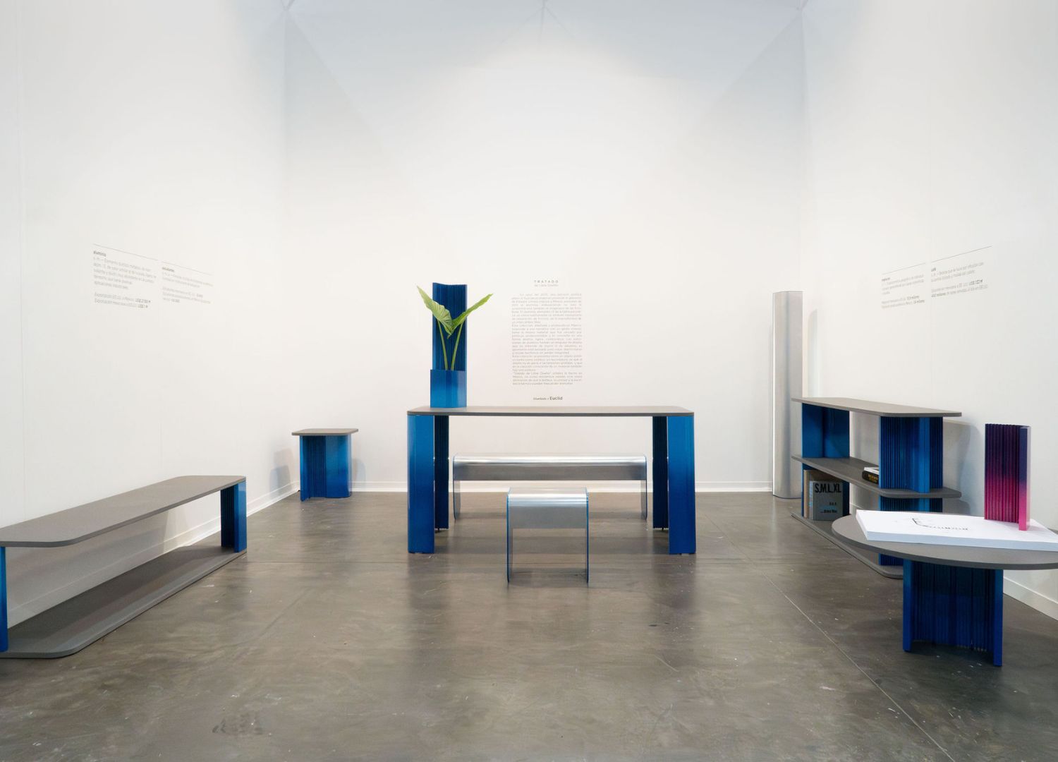 TLD stands for Tratado de Libre Diseño, and is a collection of aluminium furniture based on a single extrusion profile. During the fair, Euclid distributed the technical drawing of the profile freely, following an open source philosophy to oppose the idea of borders as barriers. This sharing of knowledge liberated the drawing and the material itself, allowing for the object to be replicated by circulating outside of tariffs, outside of political control.